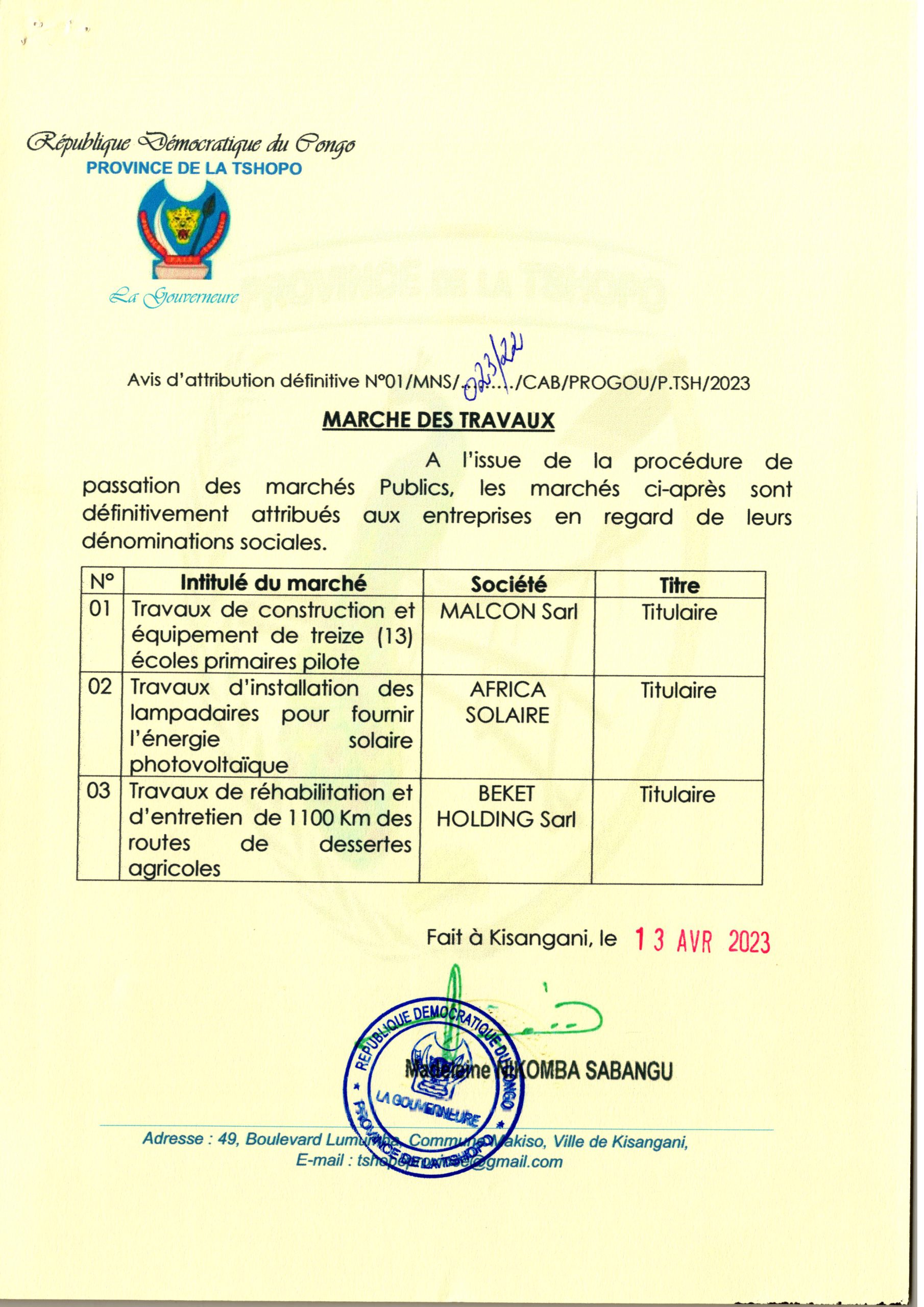 ATTRIBUTION DEFINITIVE ACCORDEE A 3 SOCIETES POUR LES MARCHES REPRIS DANS LE TABLEAU LE DOCUMENT Y REFERENT.