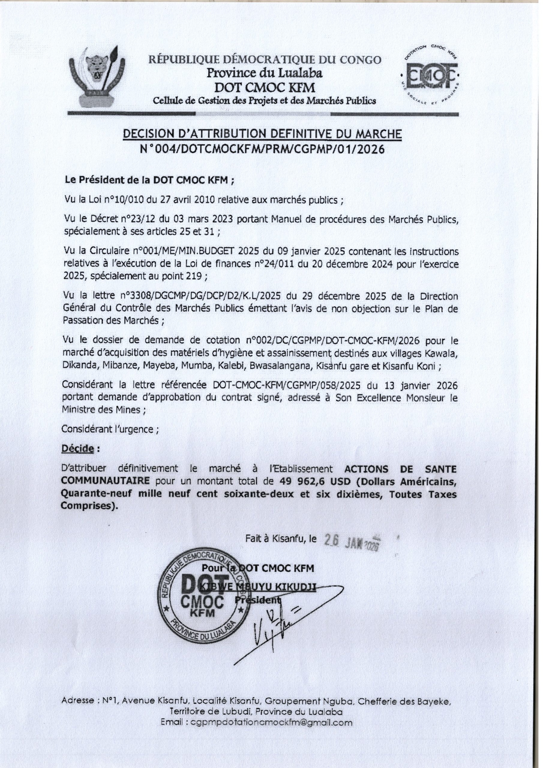 Attribution définitive accordée à la société “ACTIONS DE SANTE COMMUNAUTAIRE” relative au marché d’acquisition des matériels hygiène et assainissement destinés aux villages Kawala, Dikanda, Mibanze, Mayeba, Mumba, Kalebi, Bwasalanga, Kisanfu gare et Kisanfu Koni.