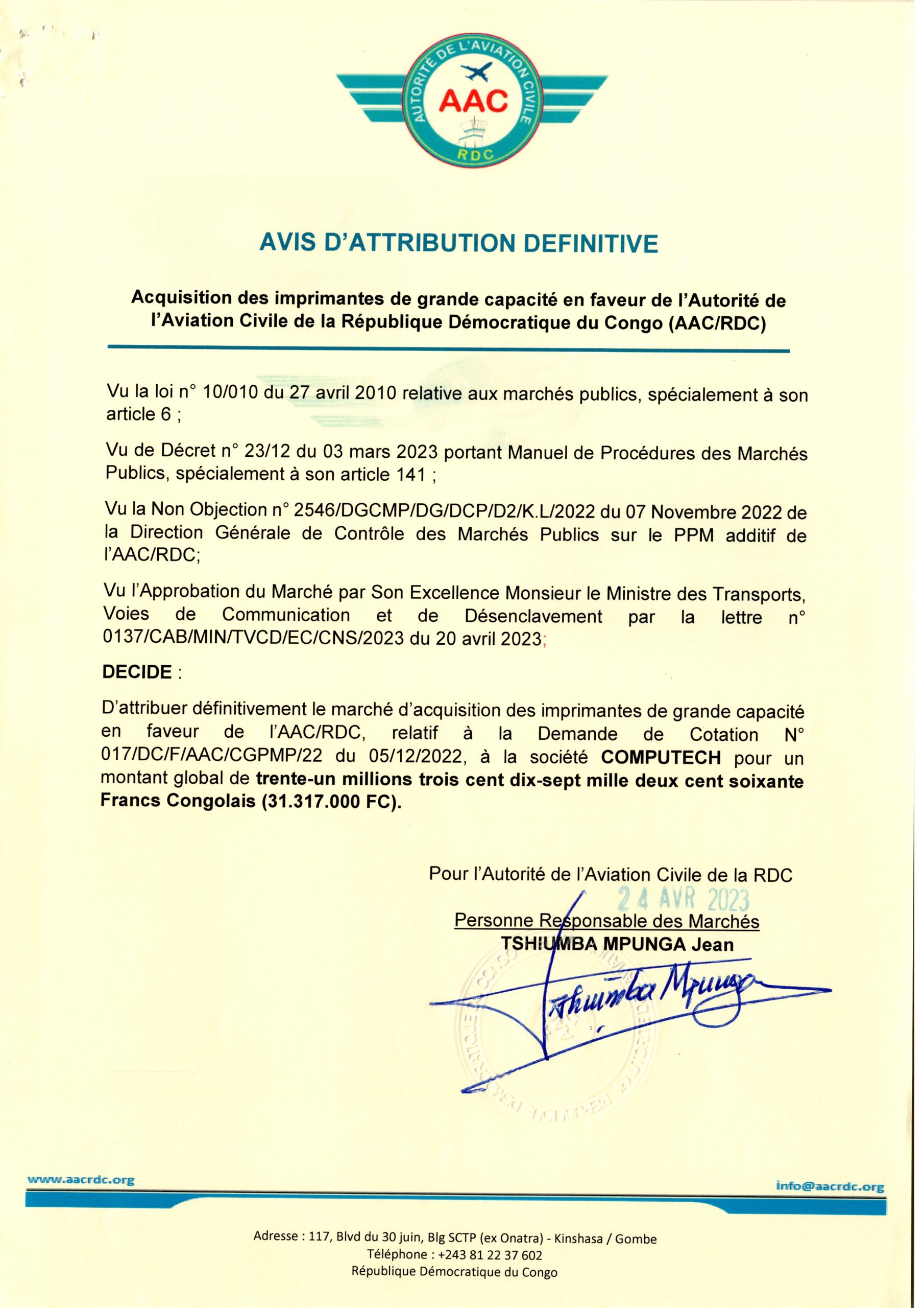 Attribution définitive accordée à la société COMPUTECH relative à l’acquisition des imprimantes de grande capacité en faveur de l’AAC/RDC.