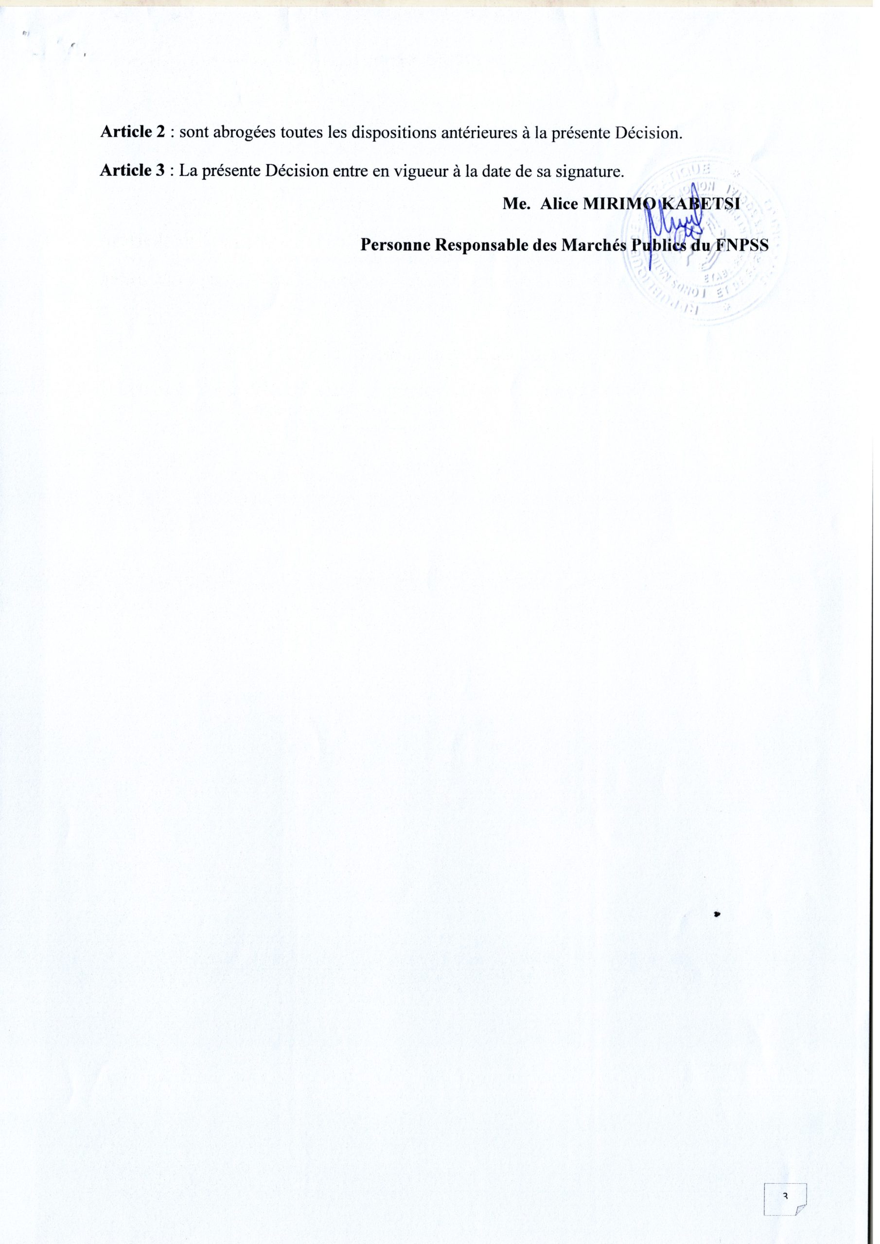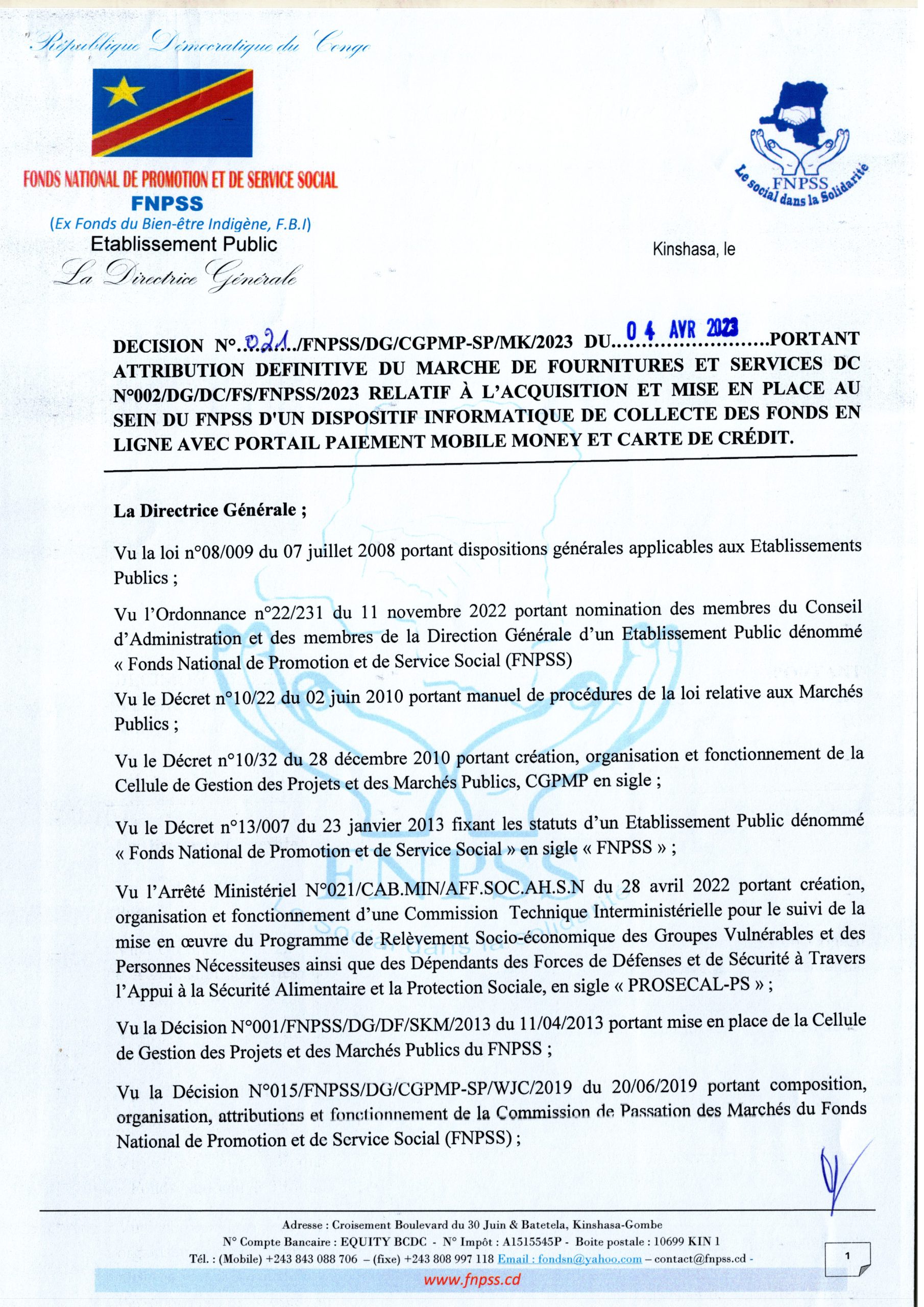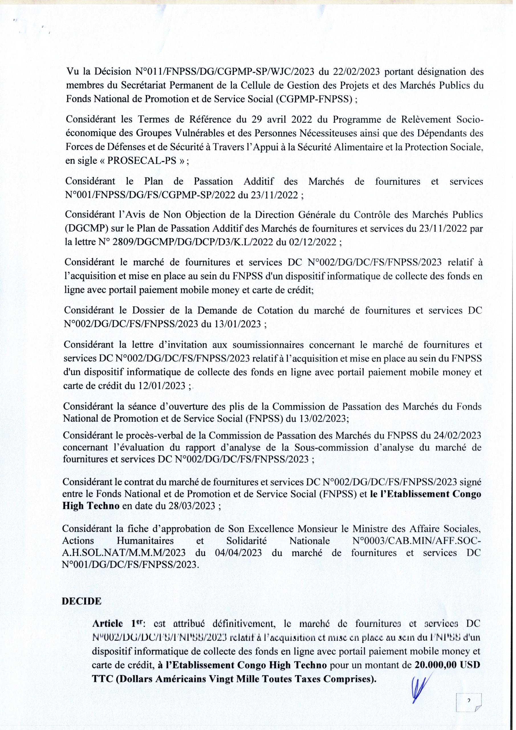 ATTRIBUTION DEFINITIVE ACCORDEE A LA SOCIETE ” Congo High Techno” LE MARCHE RELATIF A L’ACQUISITION ET MISE EN PLACE AU SEIN DU FNPSS D’UN DISPOSITIF INFORMATIQUE DE COLLECTE DES FONDS EN LIGNE AVEC PORTAIL PAIEMENT MOBILE MONEY ET CARTE DE CREDIT