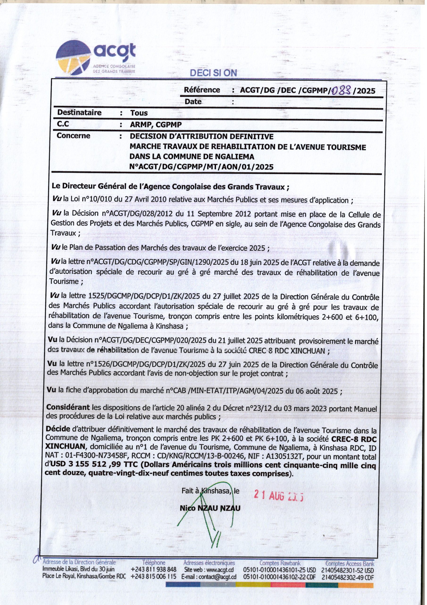 Attribution définitive accordée à la société “CREC-8 RDC XINCHUAN” relatif aux travaux de réhabilitation de l’avenue ‘TOURISME’ dans la commune de Ngaliema.