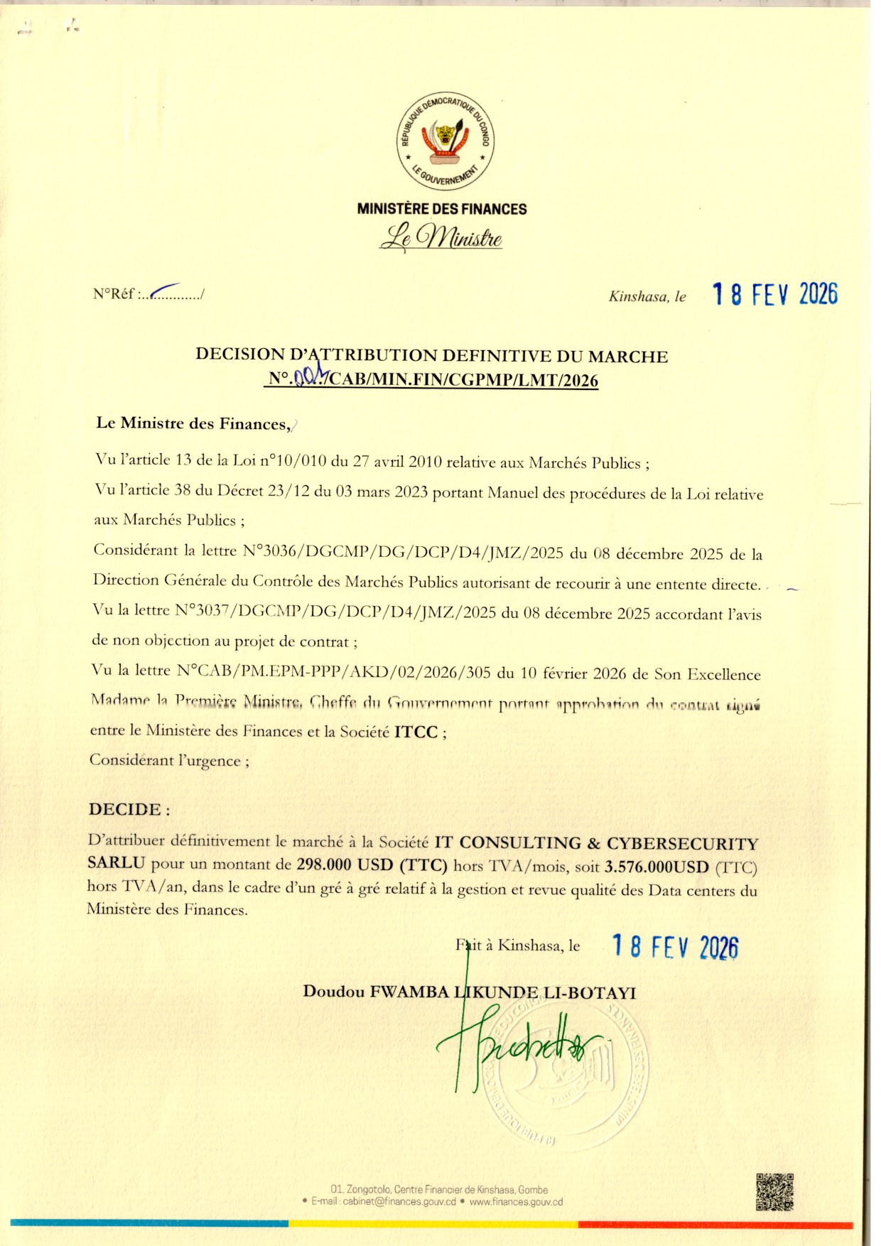 Attribution définitive accordée à la société IT CONSULTING & CYBERSECURITY SARLU relative à la gestion et revue qualité des Data center du Ministère des Finances.