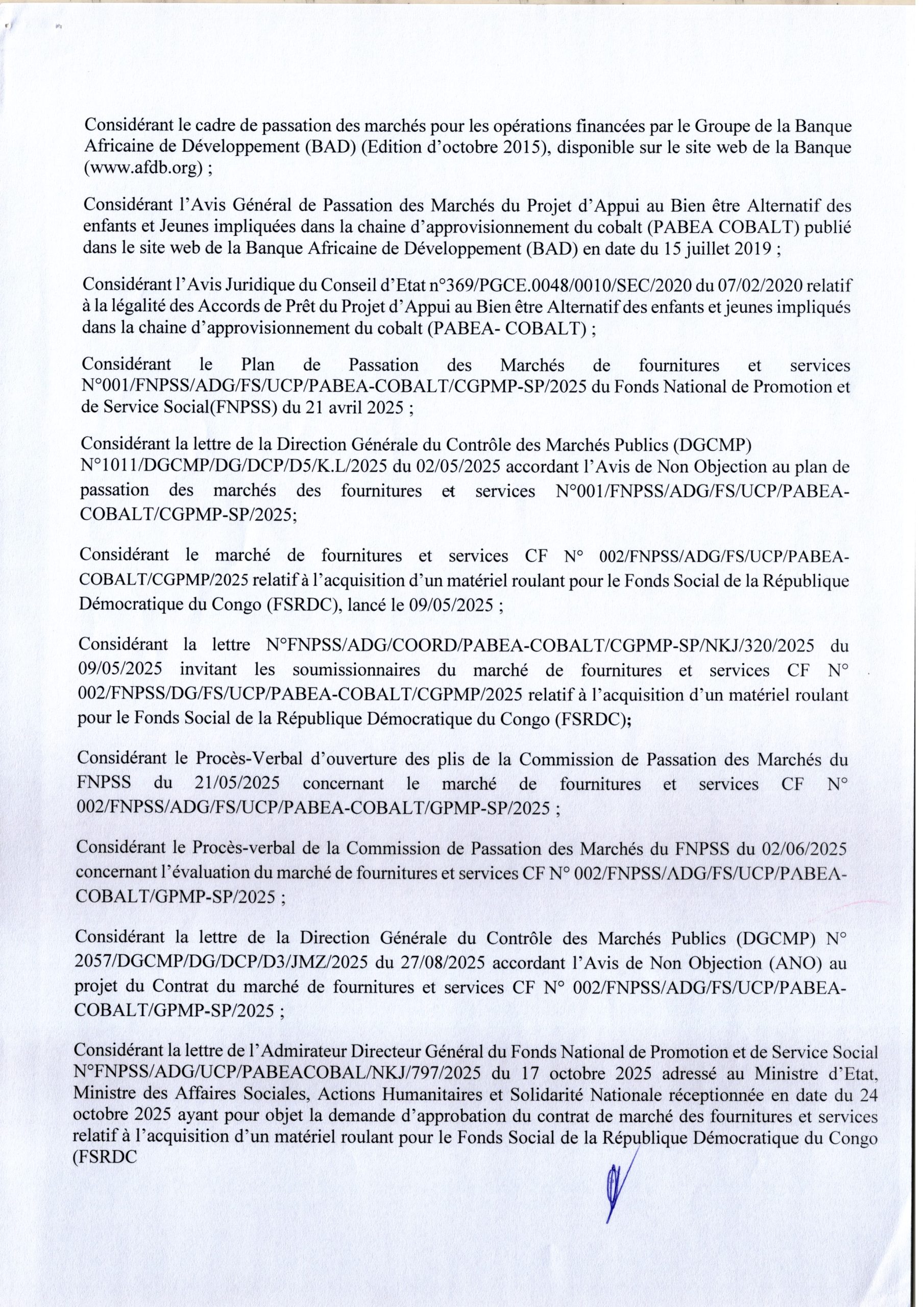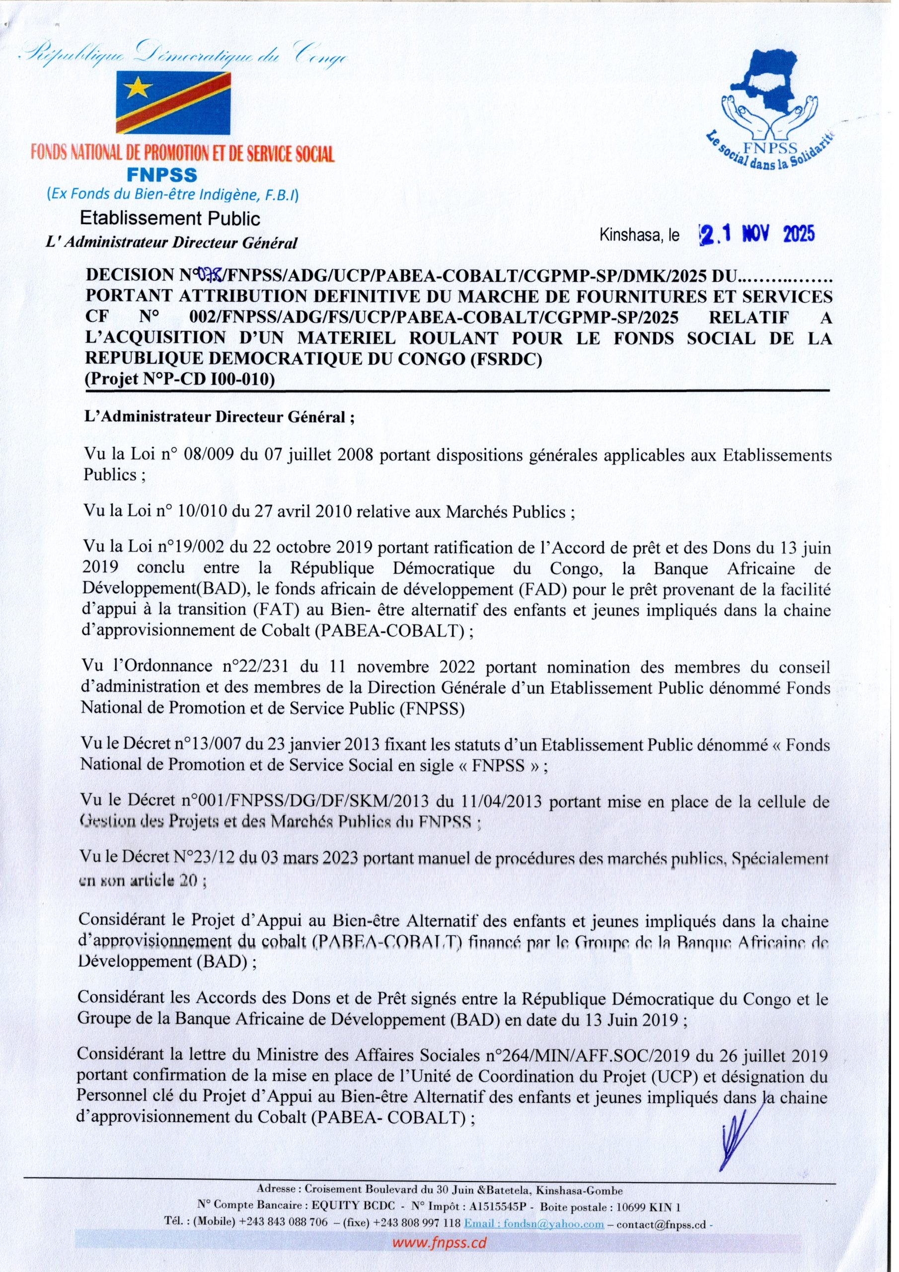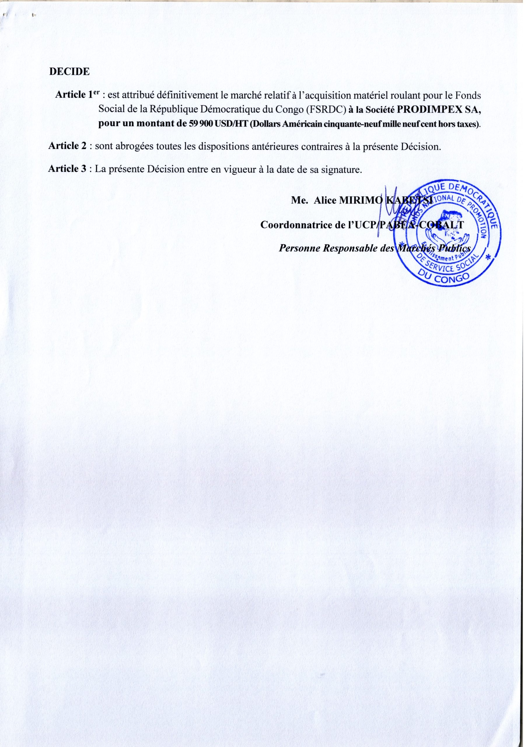 Attribution définitive accordée à la société “PRODIMPEX S.A” relatif au marché d’acquisition d’un matériel roulant pour le Fonds Social de la RDC (FSRDC).