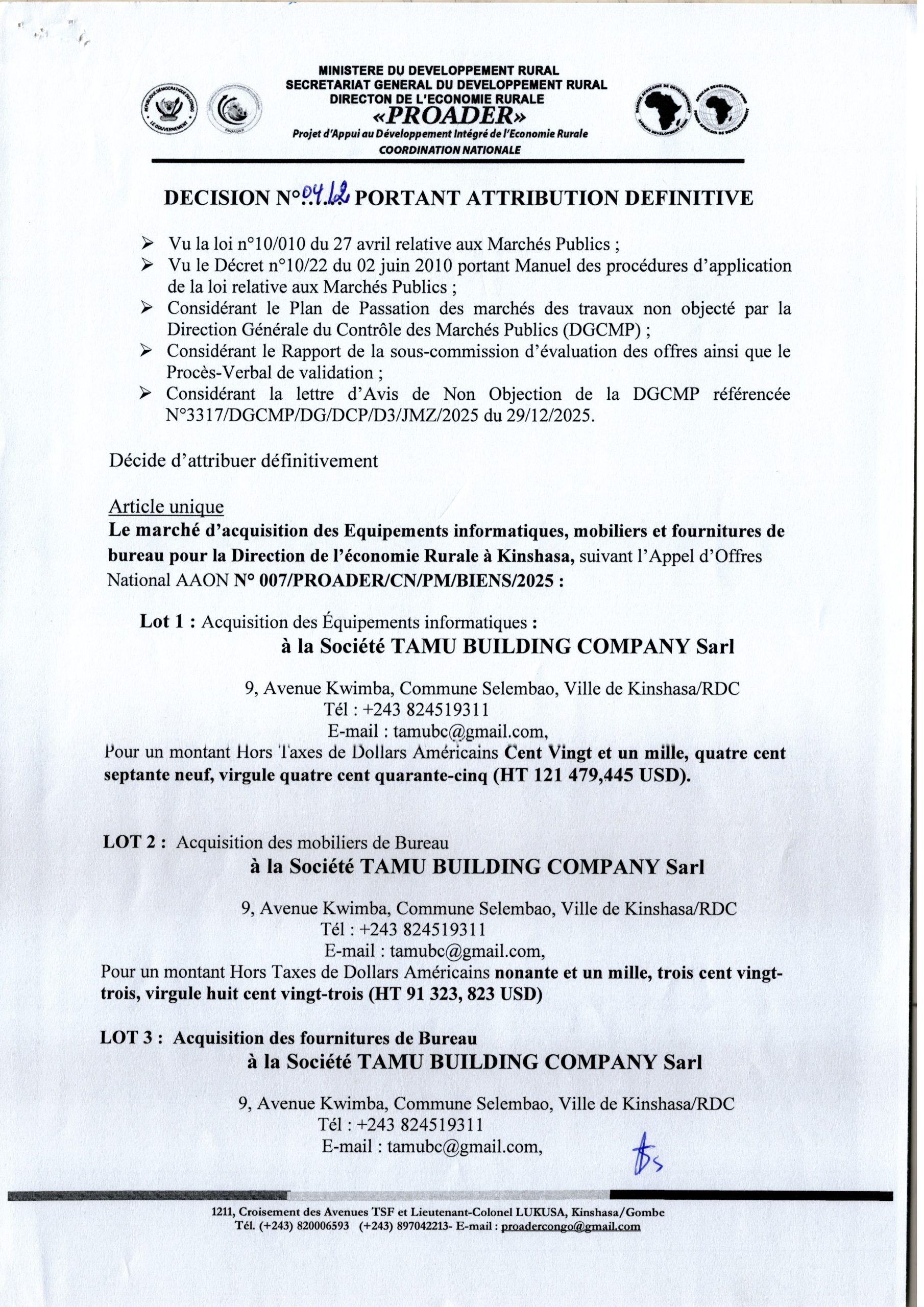 Attribution définitive accordée à la société “TAMU BUILDING COMPANY SARL” relative au marché d’acquisition des équipements informatiques, mobiliers et fournitures de bureau pour la direction de l’économie Rurale de Kinshasa en 3 lots.