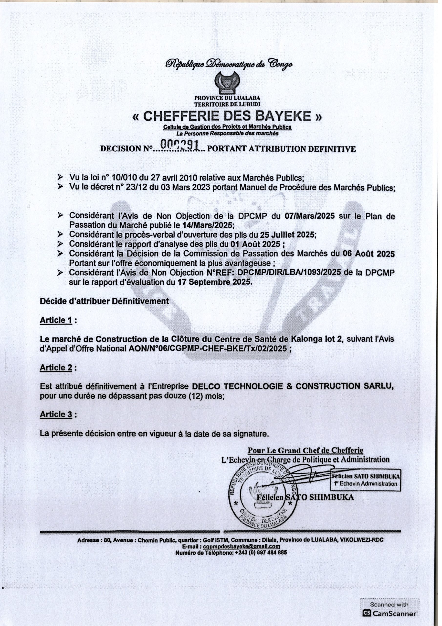 Attribution définitive accordée à l’Entreprise “DELCO TECHNOLOGIE & CONSTRUCTION SARLU” relative au marché de construction d’un centre de santé avec clôture à Kalonga lot 2.