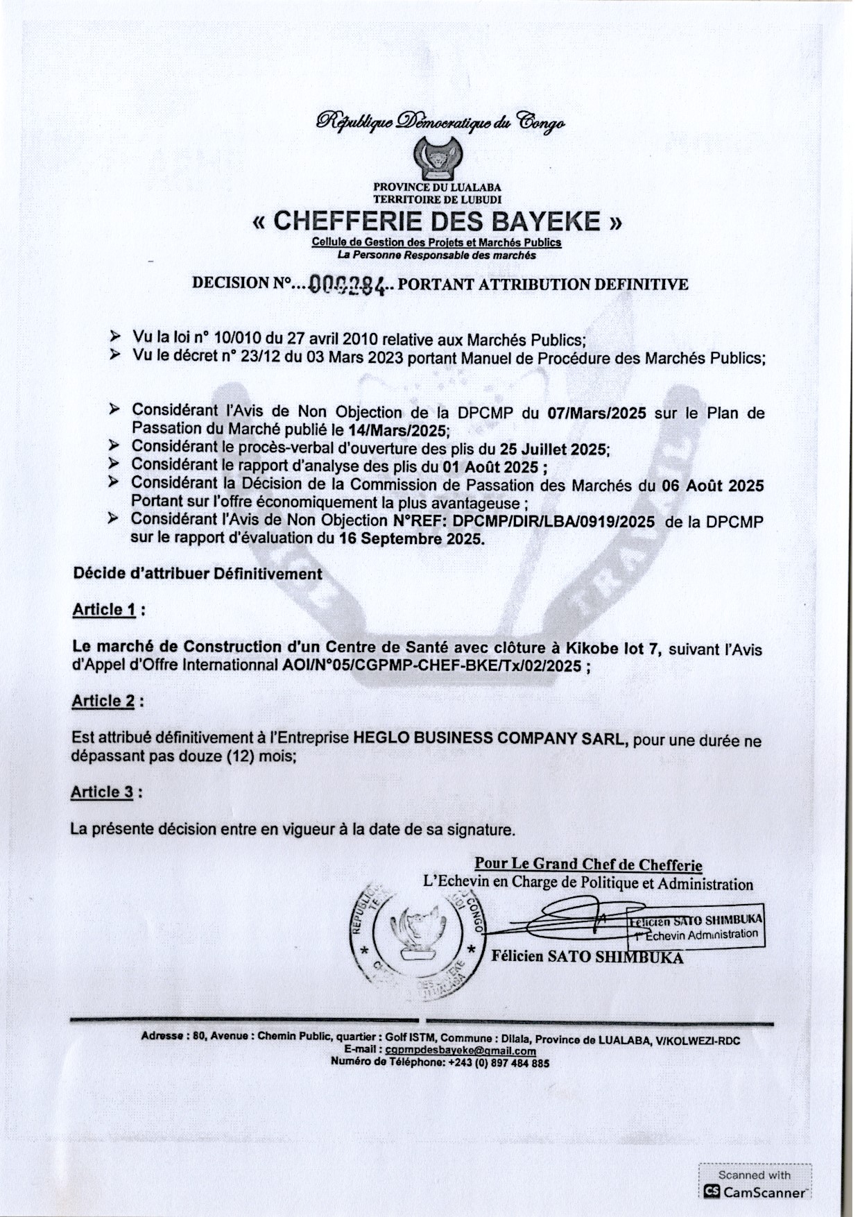 Attribution définitive accordée à l’Entreprise HELGO BUSINESS COMPAGNY SARL relative à la construction d’un centre de santé avec clôture à KIKOBE (lot 7).