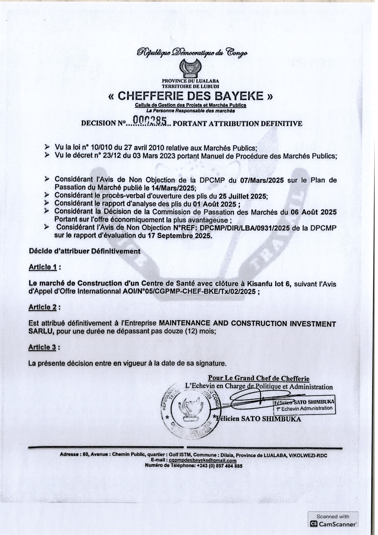 Attribution définitive accordée à l’Entreprise MAINTENANCE AND CONSTRUCTION INVESTMENT SARLU relative à la construction d’un Centre de Santé avec clôture à Kisanfu (Lot 6)