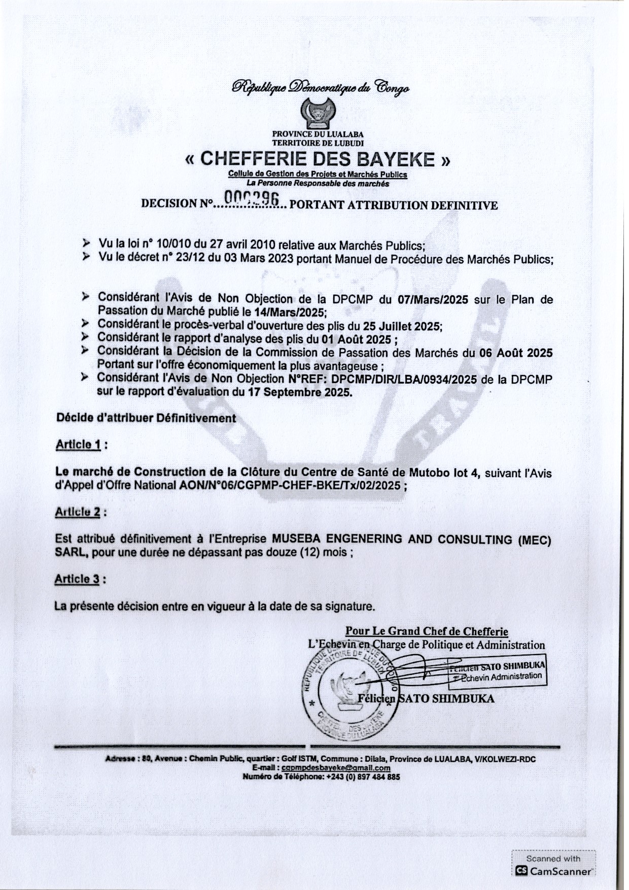 Attribution définitive accordée à l’Entreprise MUSEBA ENGENERING AND CONSULTING (MEC) Sarl relative à la construction de la clôture du centre de santé de Mutobo (lot 4).
