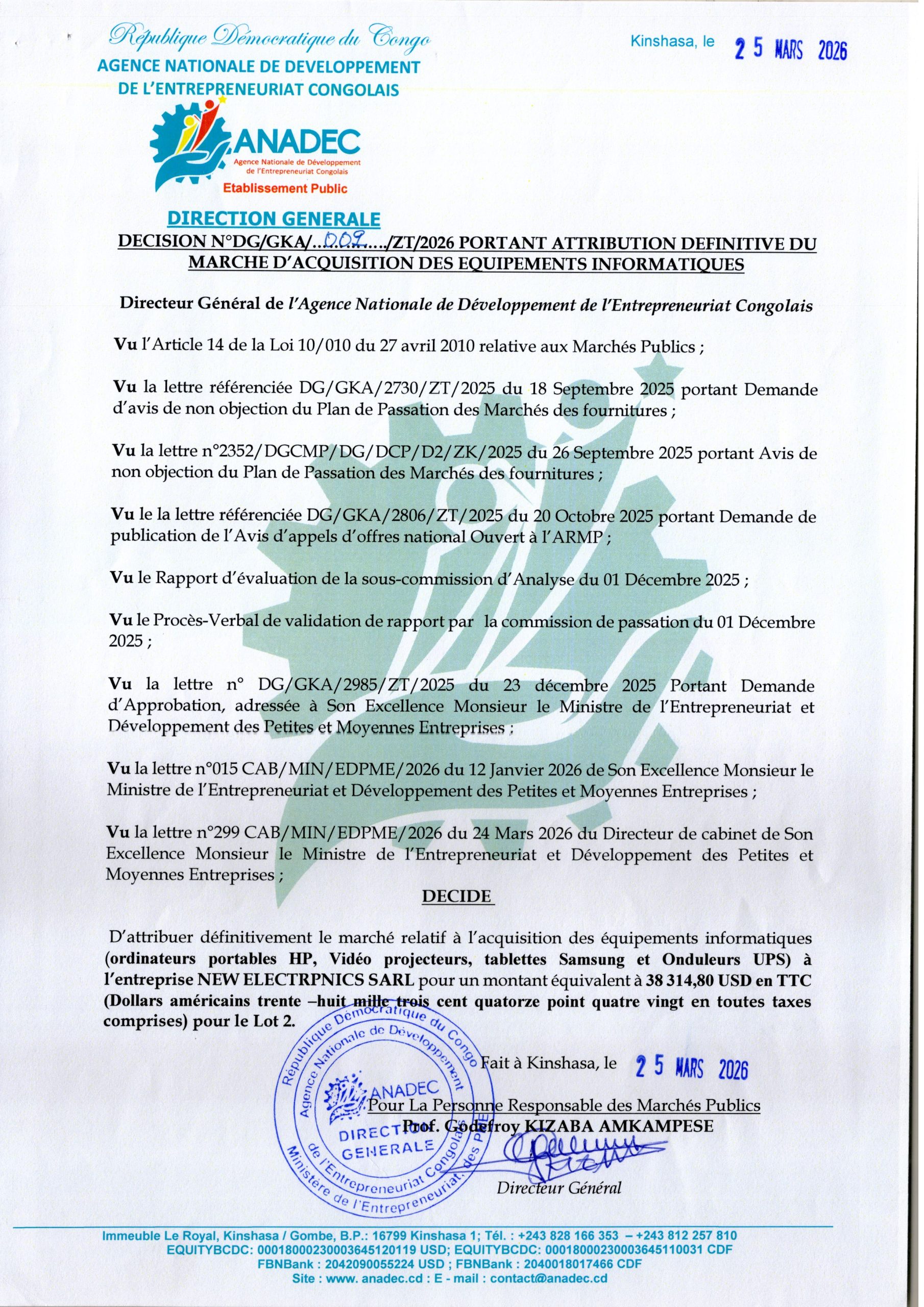 Attribution définitive accordée à l’Entreprise NEW ELECTRPNICS SARL relative à l’acquisition des équipements informatiques.