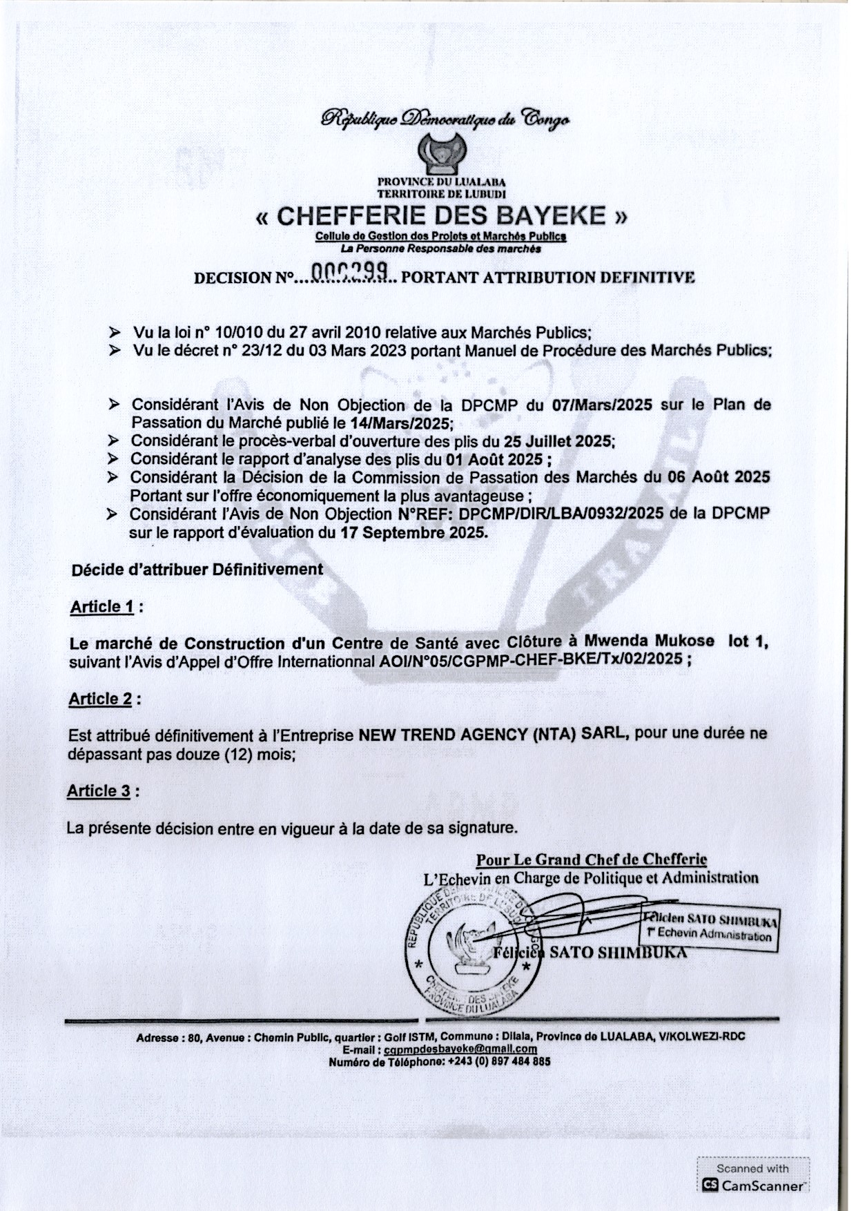 Attribution définitive accordée à l’Entreprise NEW TREND AGENCY (NTA) SARL relative à la construction d’un Centre de Santé avec Clôture à Mwenda Mukose (lot 1).