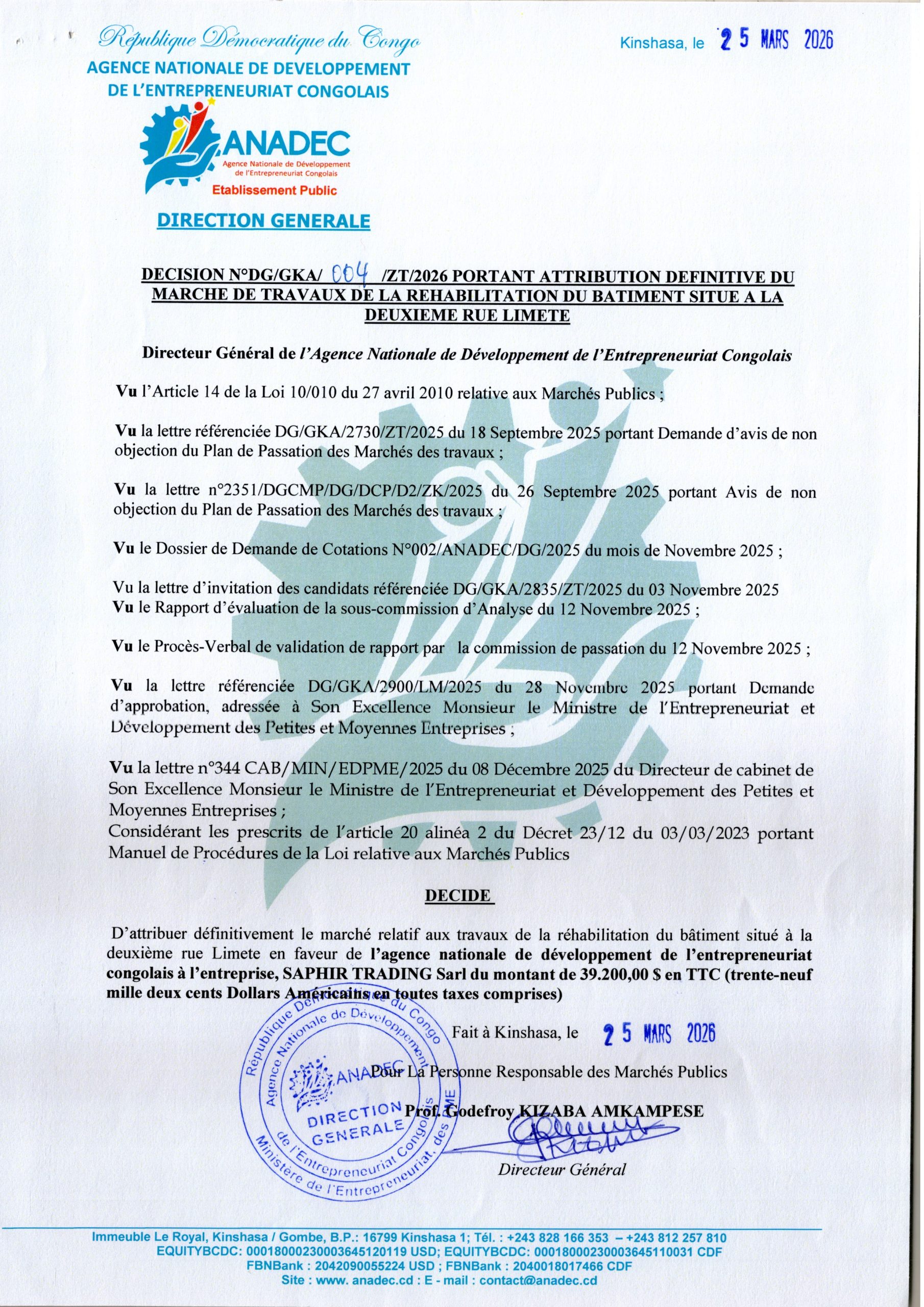 Attribution définitive accordée à l’Entreprise SAPHIR TRADING Sarl relative aux travaux de la réhabilitation du bâtiment situe à la deuxième rue Limete en faveur de l’ANADEC.