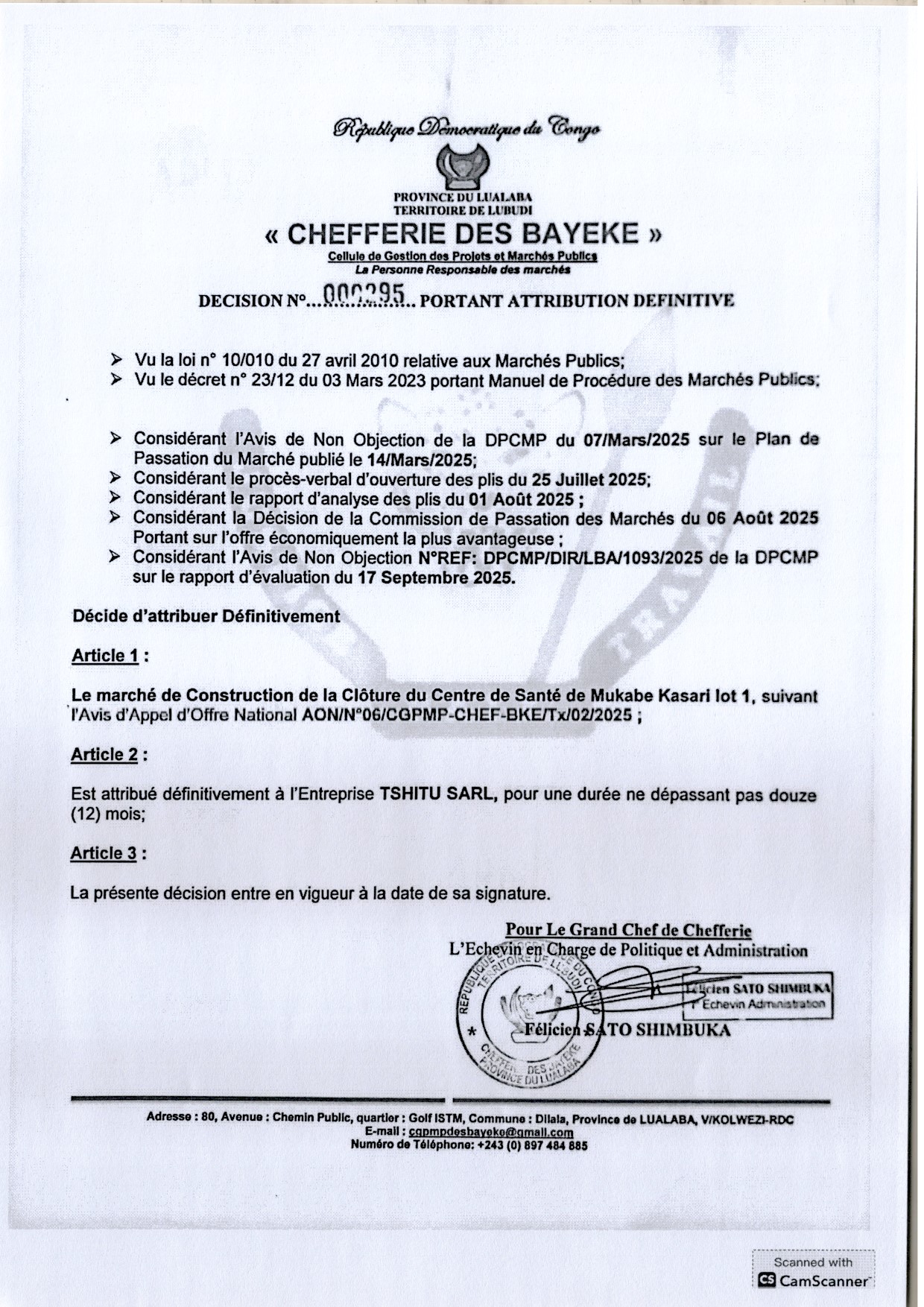 Attribution définitive accordée à l’Entreprise TSHITU SARL relative à la construction de la Clôture du Centre de santé de Mukabe Kasarl (lot 1).