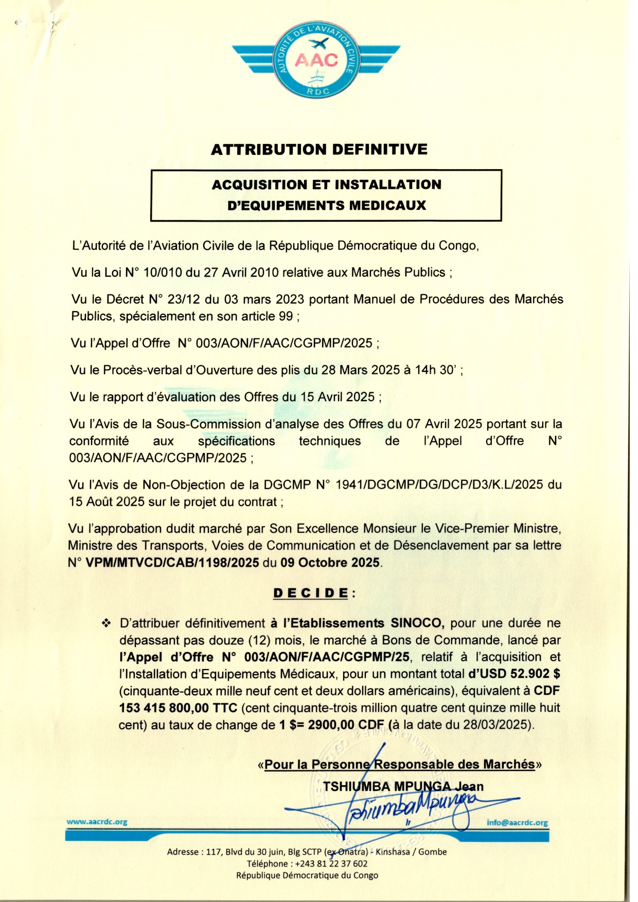 Attribution définitive accordée à l’Etablissements SINOCO relative à l’acquisition et l’installation d’équipements Médicaux.