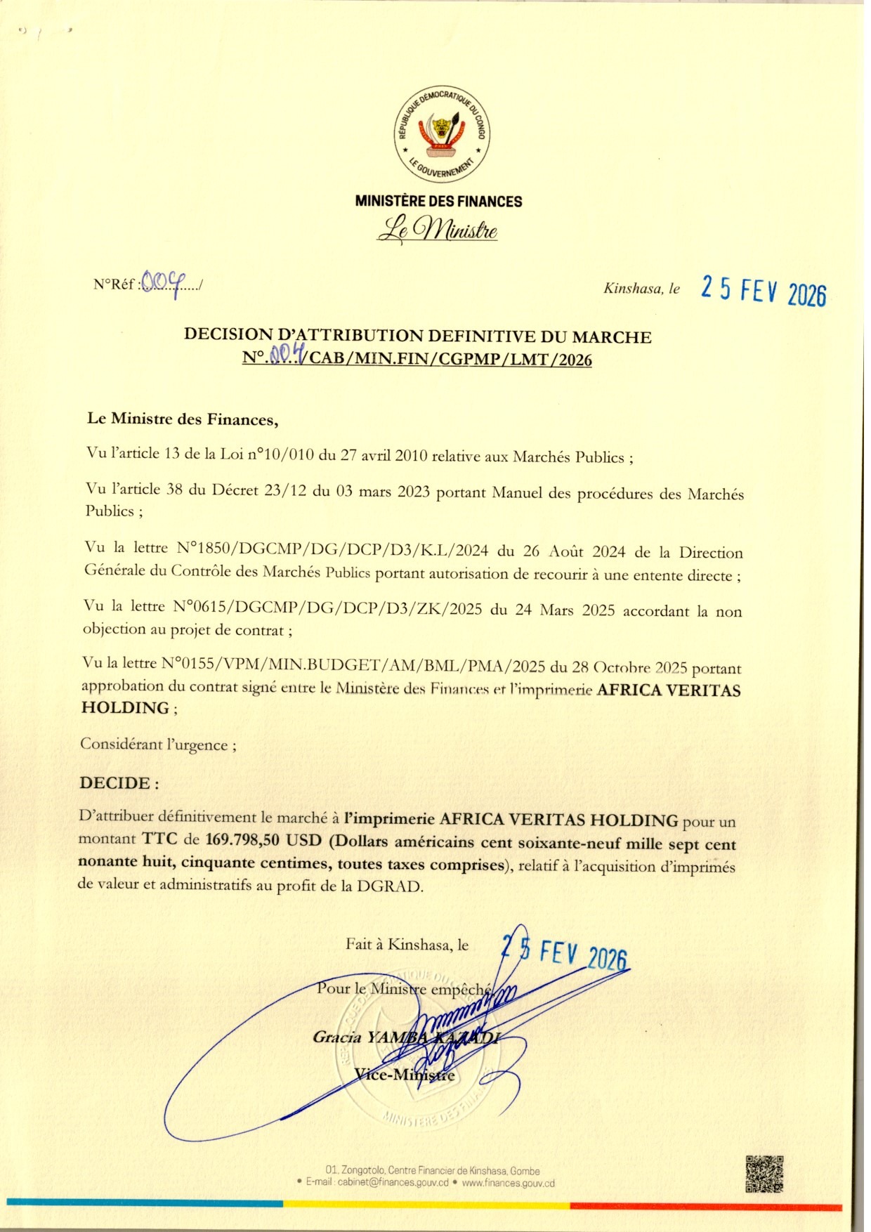 Attribution définitive accordée à l’imprimerie AFRICA VERITAS HOLDING relative à l’acquisition d’imprimés de valeur et administratifs au profit de la DGRAD.