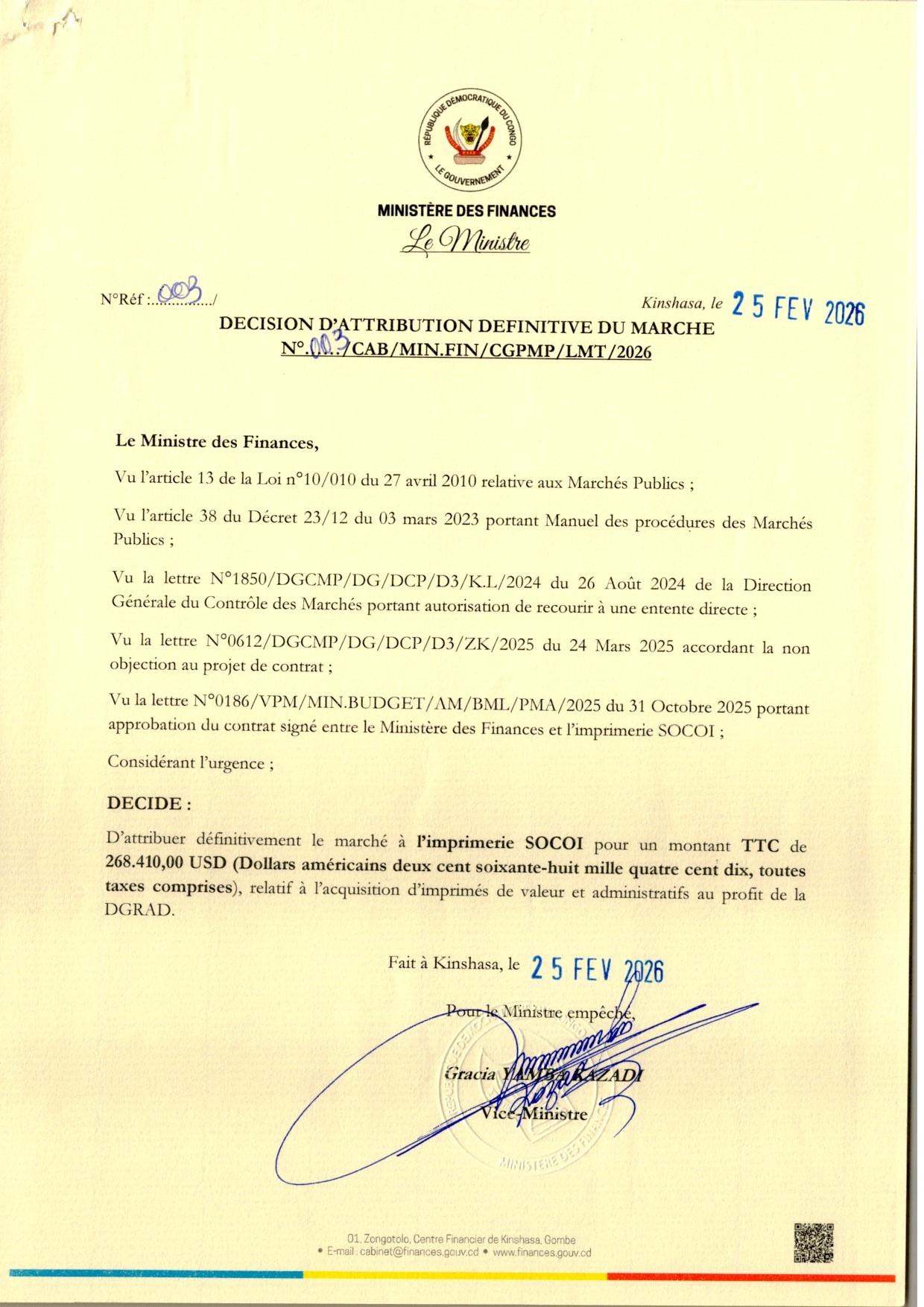 Attribution définitive accordée à l’imprimerie SOCOI relative à l’acquisition d’imprimé de valeur et administratifs au profit de la DGRAD.