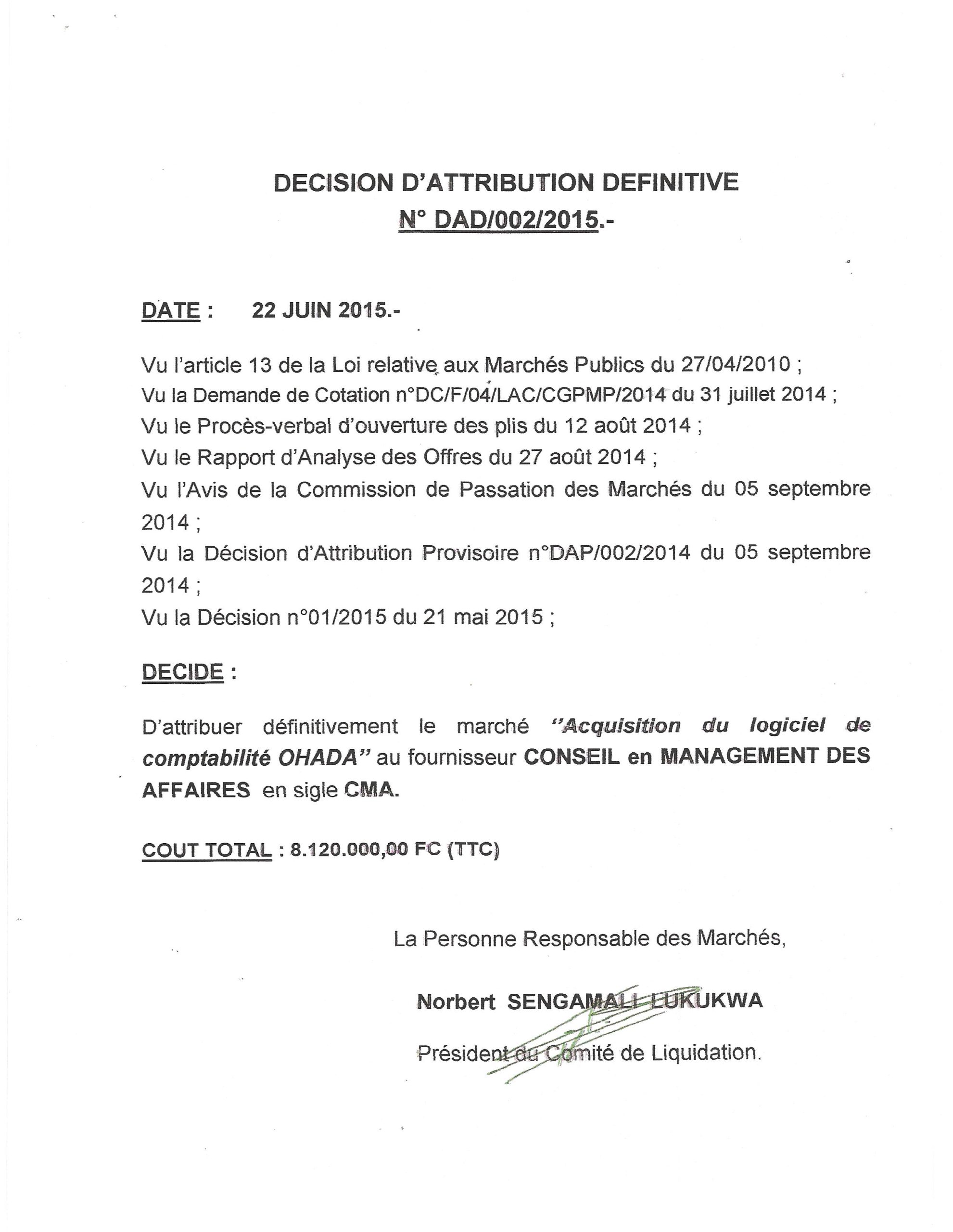 Attribution définitive accordée au fournisseur CONSEIL en MANAGEMENT des AFFAIRES en sigle CMA du marché d’acquisition du logiciel de comptabilité.