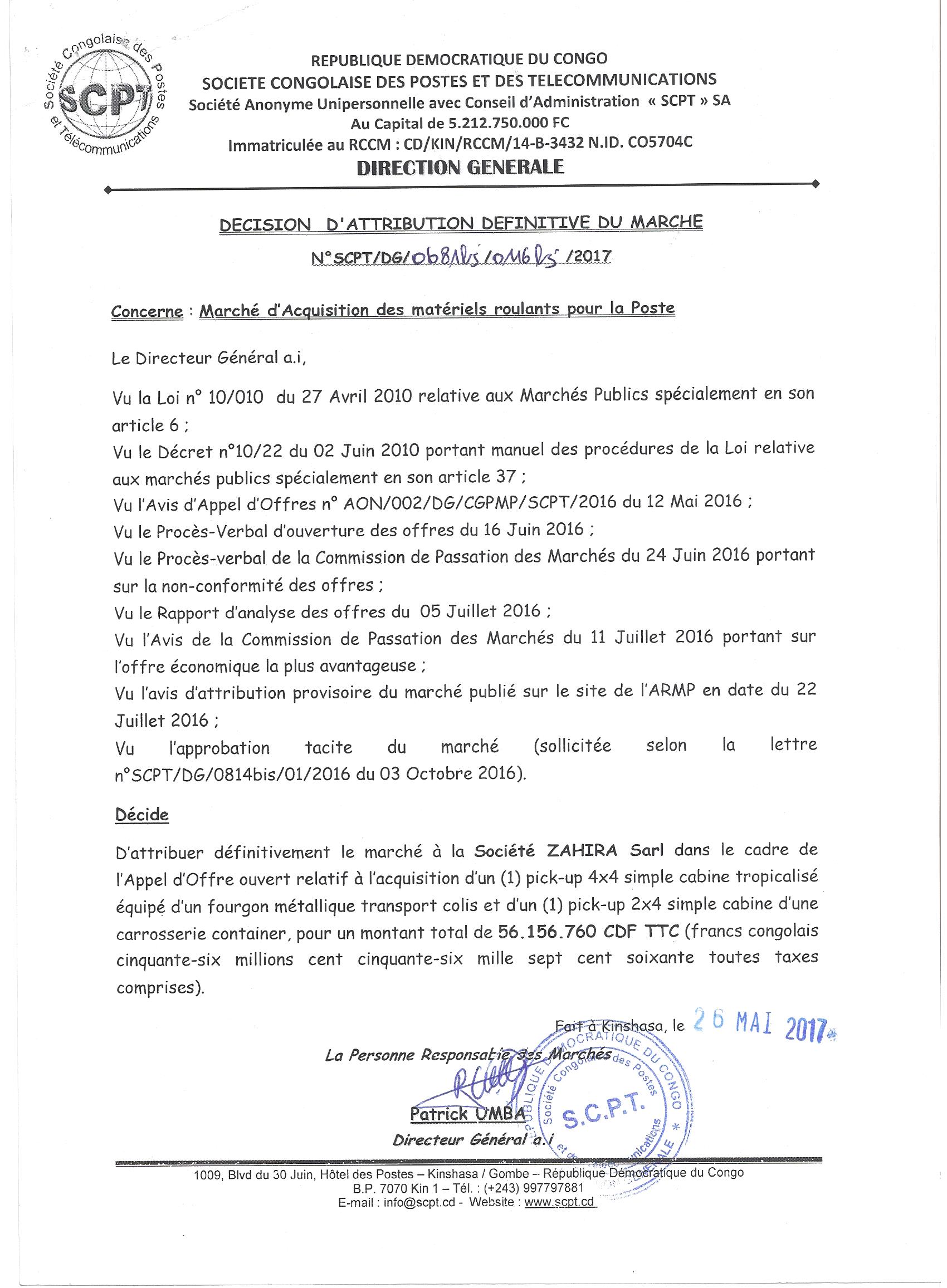 Attribution définitive du marché d’acquisition d’un pick-up simple cabine tropicalisé et d’un pick up 2×4 simple cabine d’une carrosserie container à LA SOCIÉTÉ ZAHIRA SARL