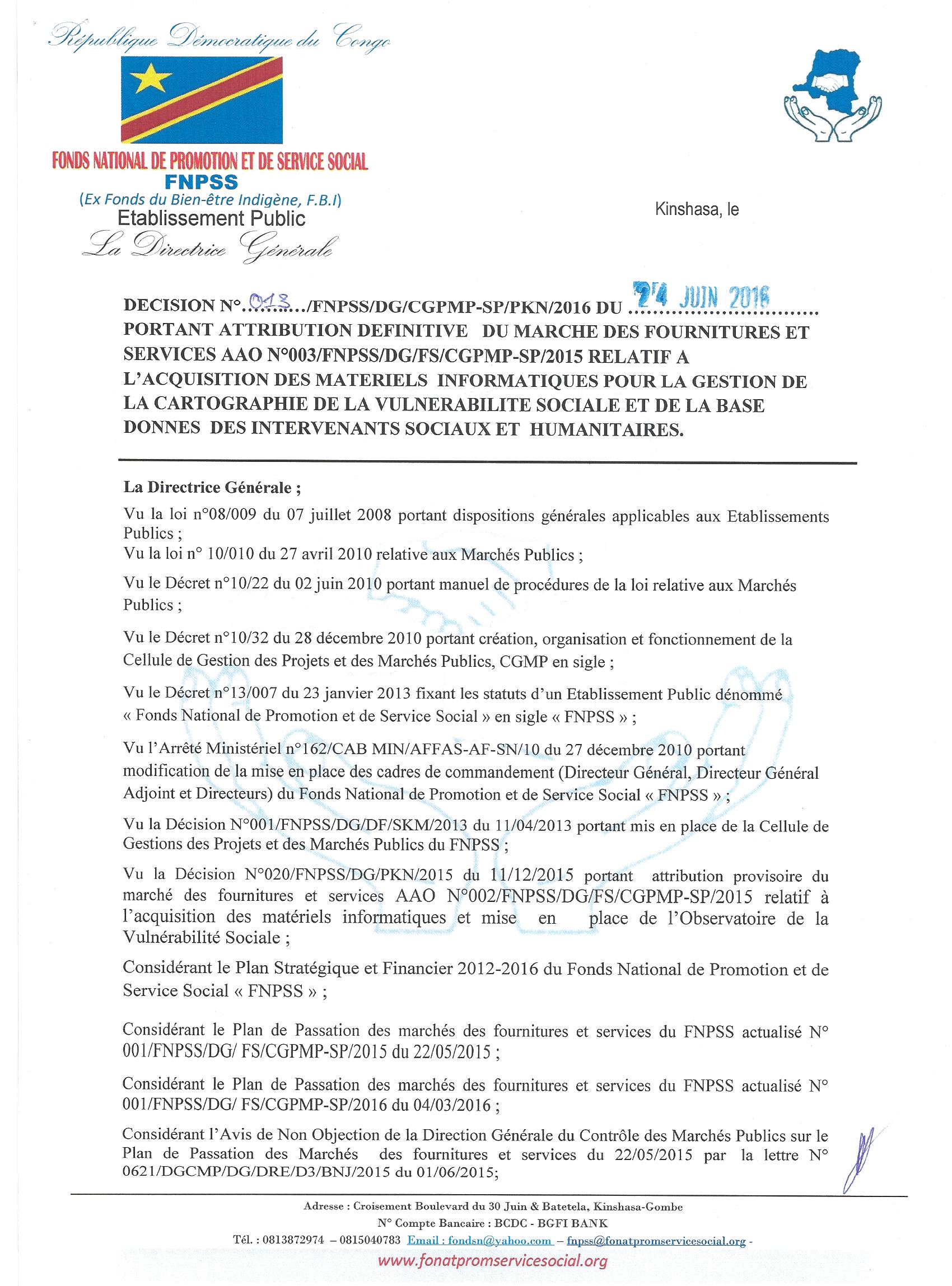 Attribution définitive du marché des fournitures et services relatif à l’acquisition des matériels informatiques pour la gestion de la cartographie de la vulnérabilité sociale et de la base donnes des intervenants sociaux et humanitaires à LA SOCIÉTÉ BUR