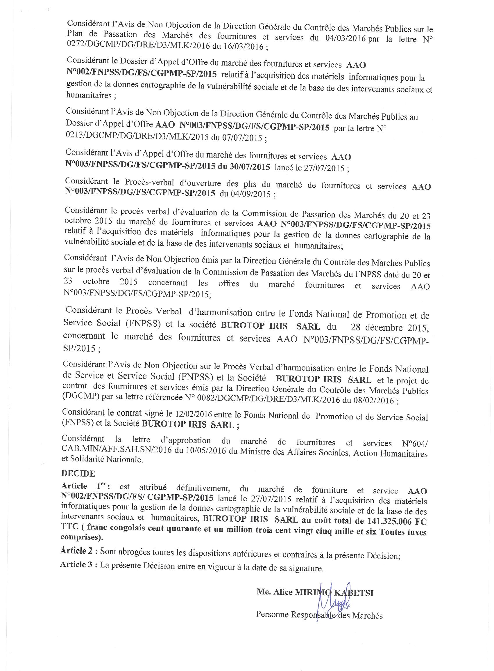 Attribution définitive du marché des fournitures et services relatif à l’acquisition des matériels informatiques pour la gestion de la cartographie de la vulnérabilité sociale et de la base donnes des intervenants sociaux et humanitaires à LA SOCIÉTÉ BUR
