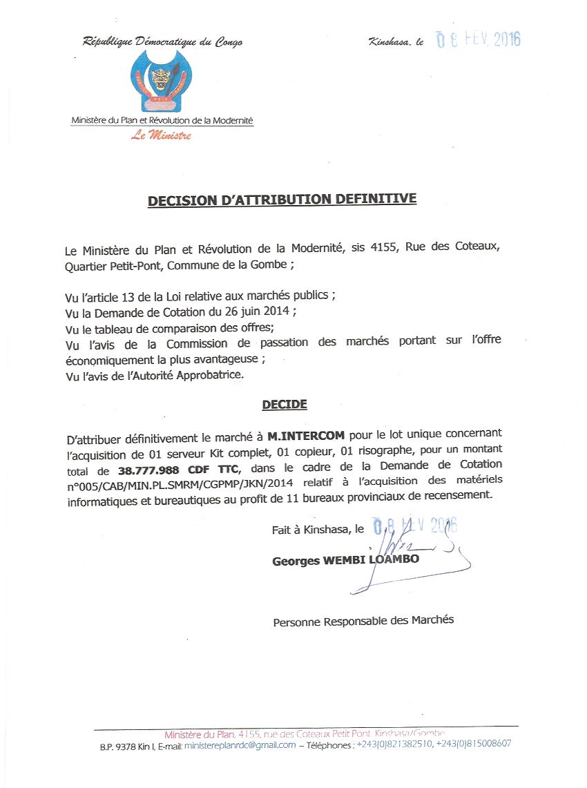 Attribution définitive du marché relatif à l’acquisition des matériels informatiques et bureautiques au profit de 11 bureaux provinciaux de recensement accordée à M. Intercom.