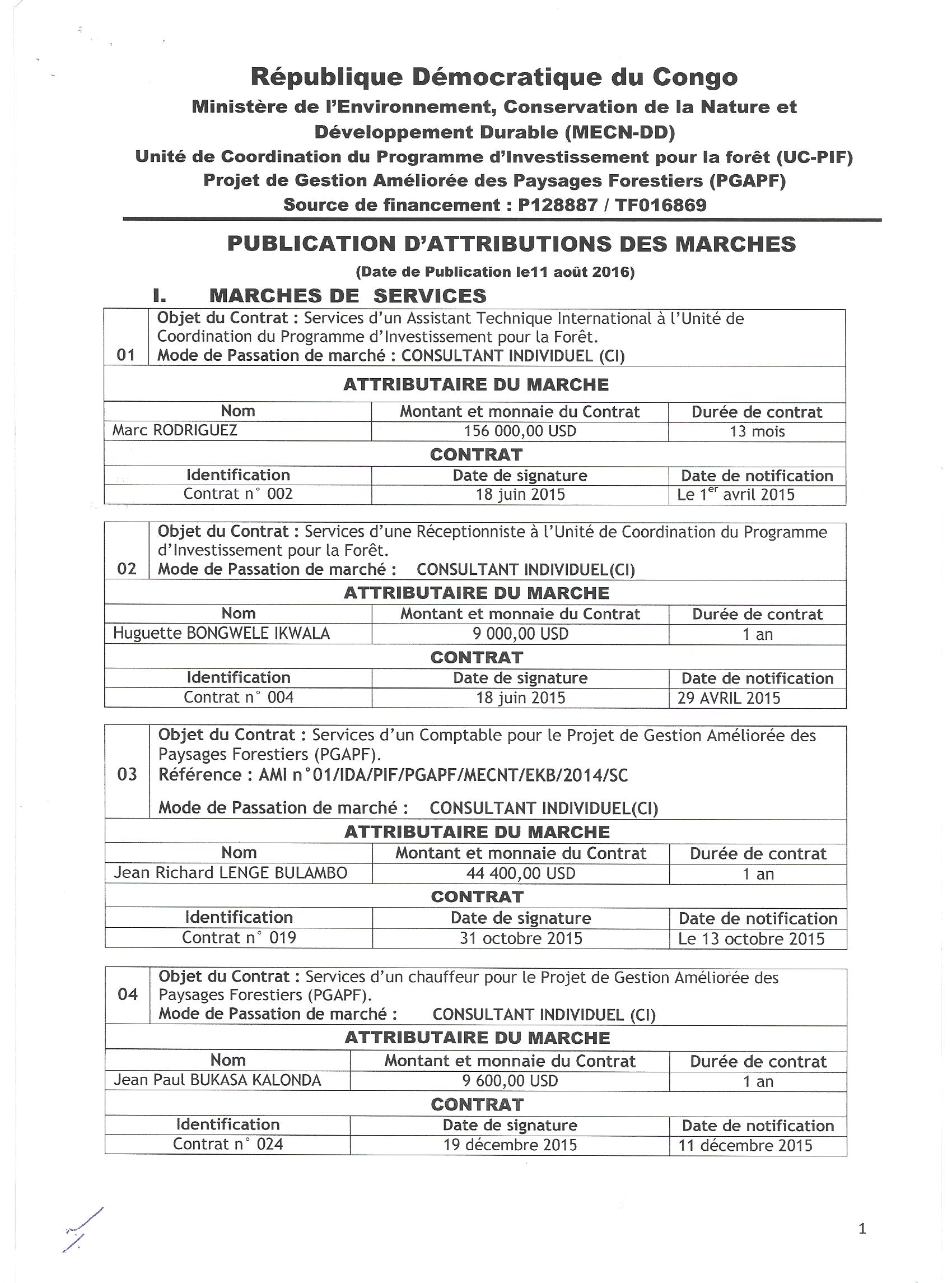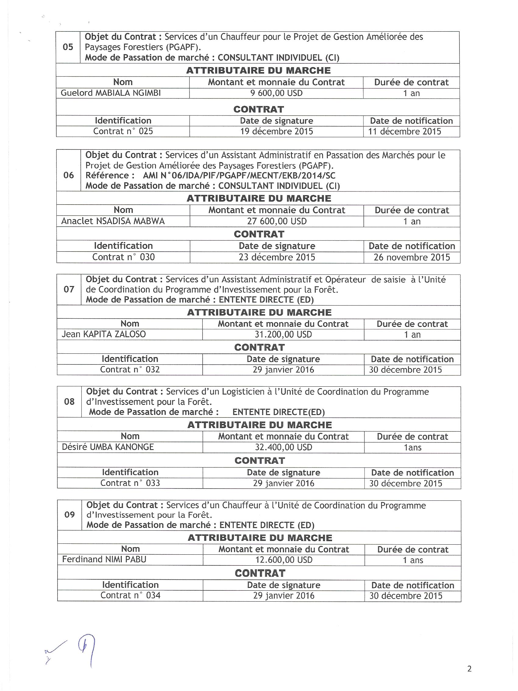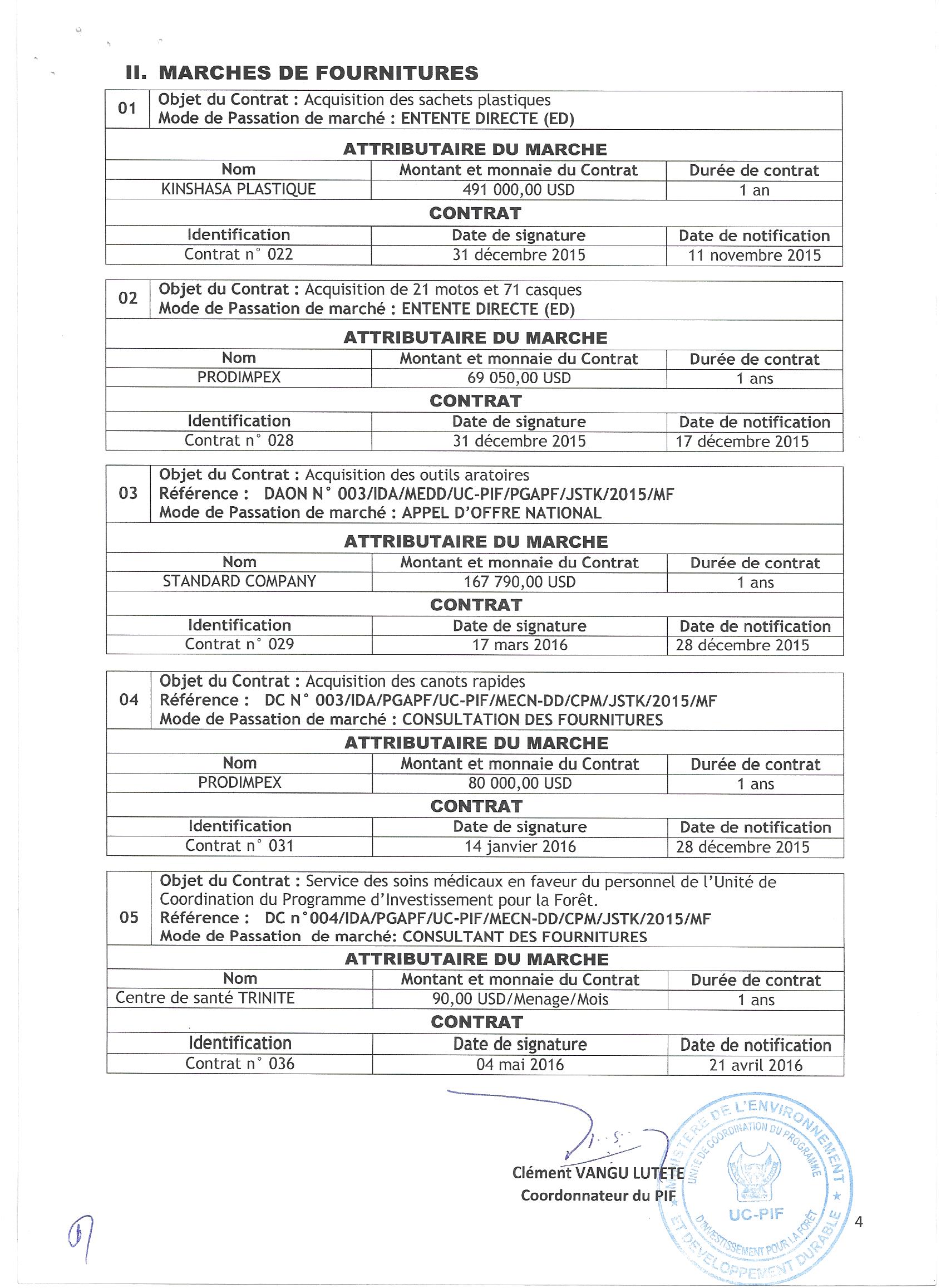 Attribution des marchés de services et de fournitures : acquisition des sachets plastiques à Kinshasa plastique, acquisition de 21 motos et 71 casques à PRODIMPEX, acquisition des outils aratoires à standard company, acquisition des canots rapides à Prodi