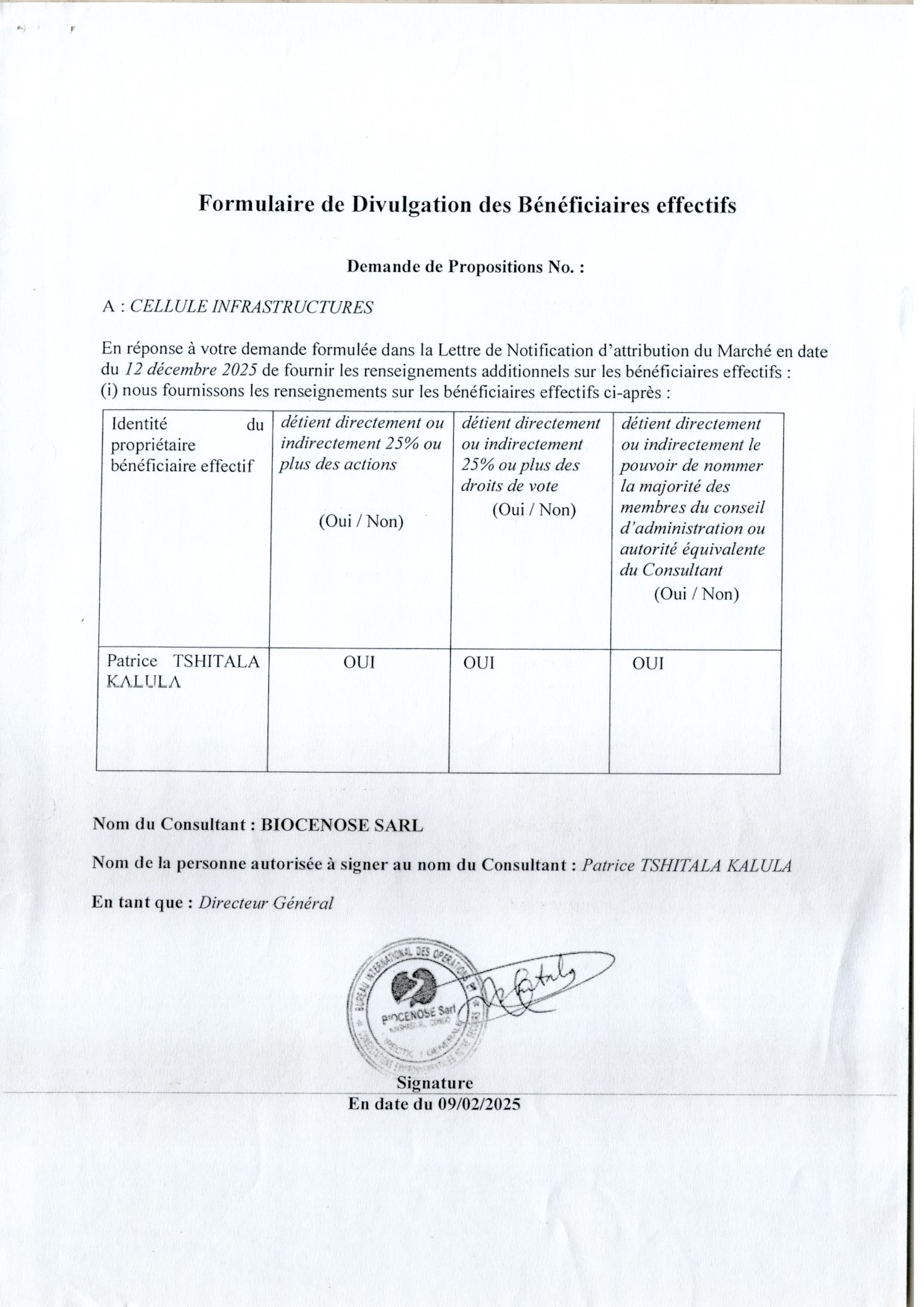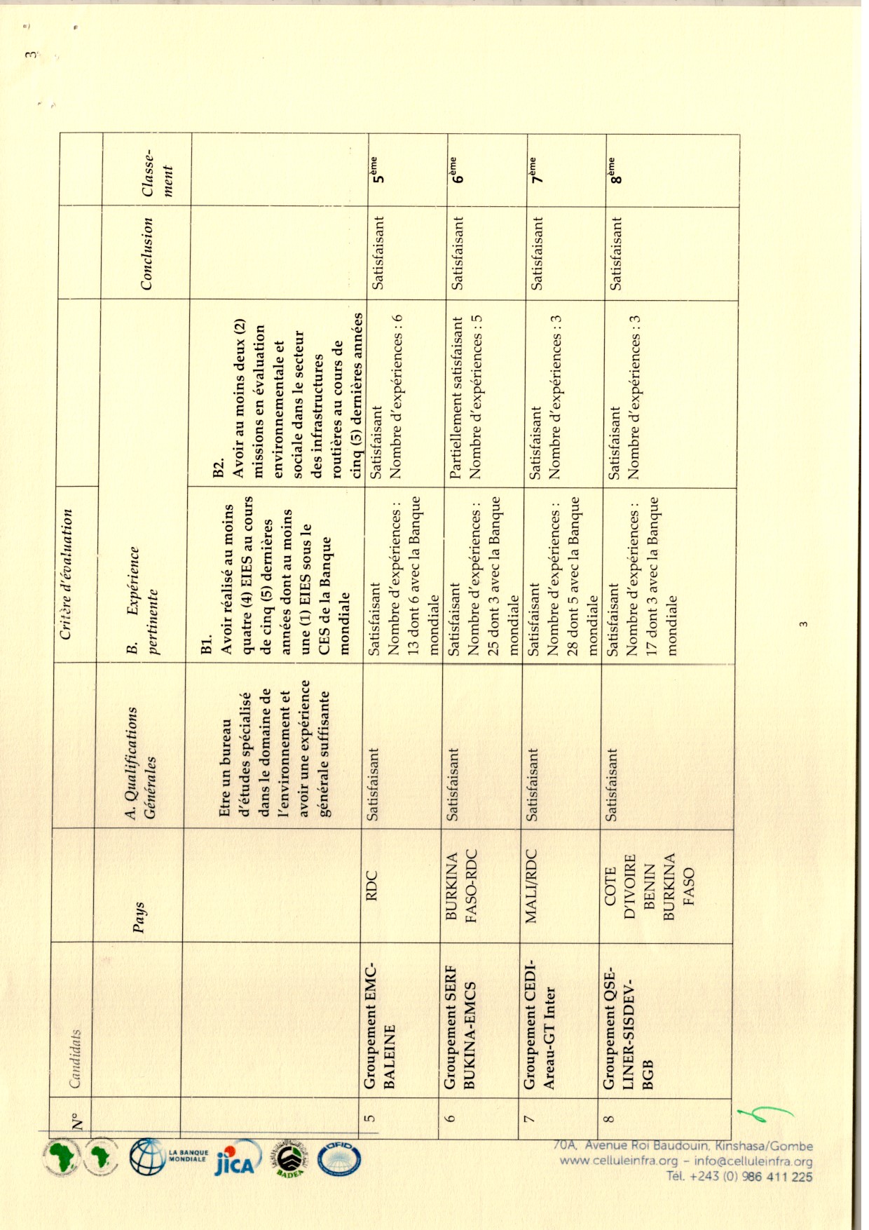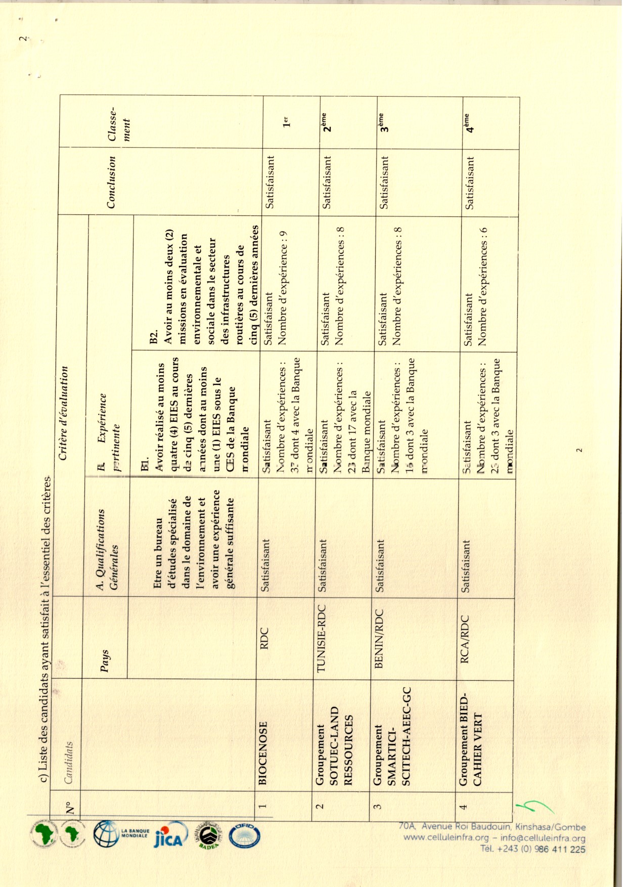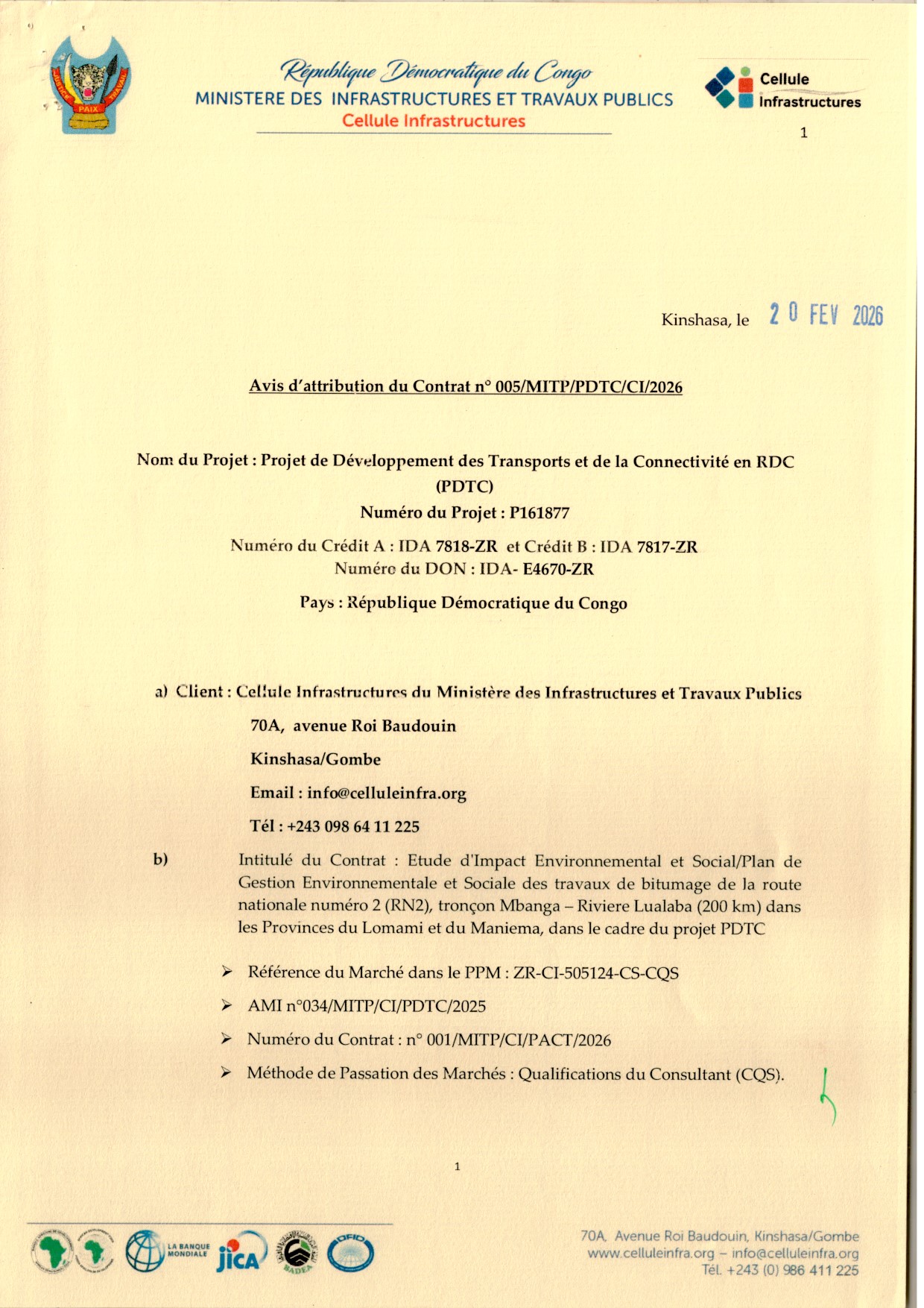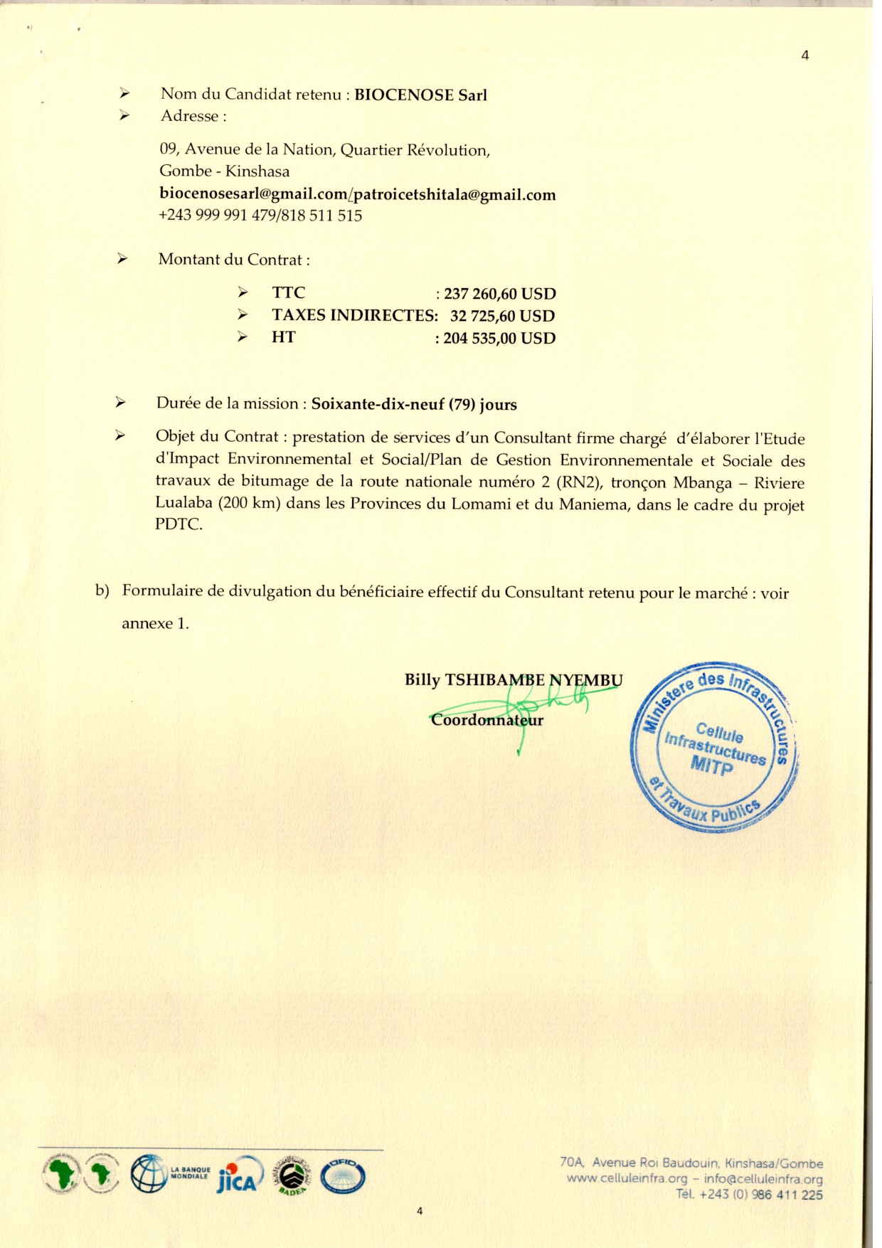 Attribution du contrat accordée au candidat retenu BIOCENOSE Sarl relative à l’étude d’impact Environnemental et Social/Plan de Gestion Environnementale et sociale des travaux…
