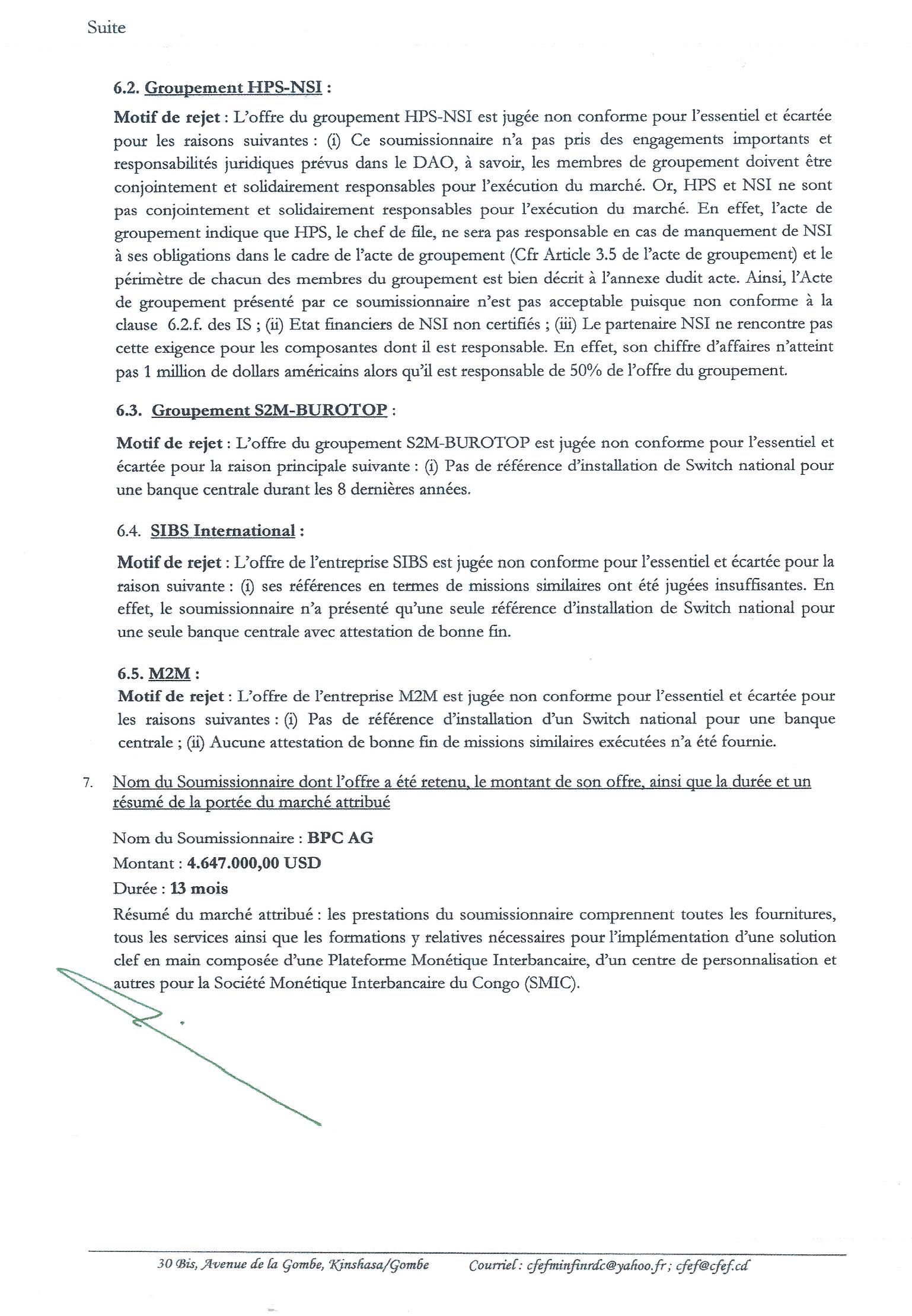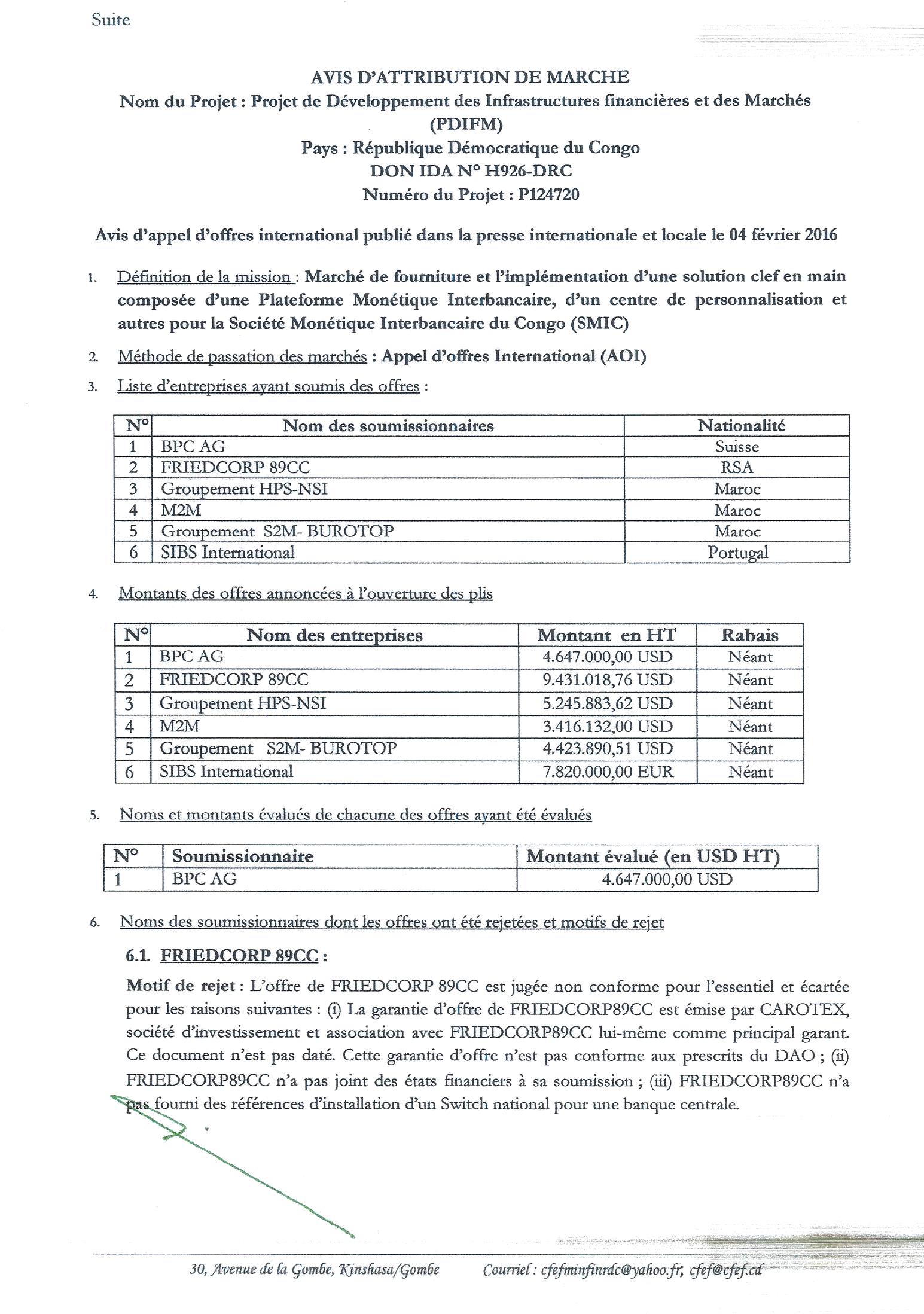 Attribution du marché de fourniture et l’implémentation d’une solution clef en main composée d’une plateforme monétique interbancaire, d’un centre de personnalisation et autres pour la société monétique interbancaire du Congo (smic) à bpc ag.