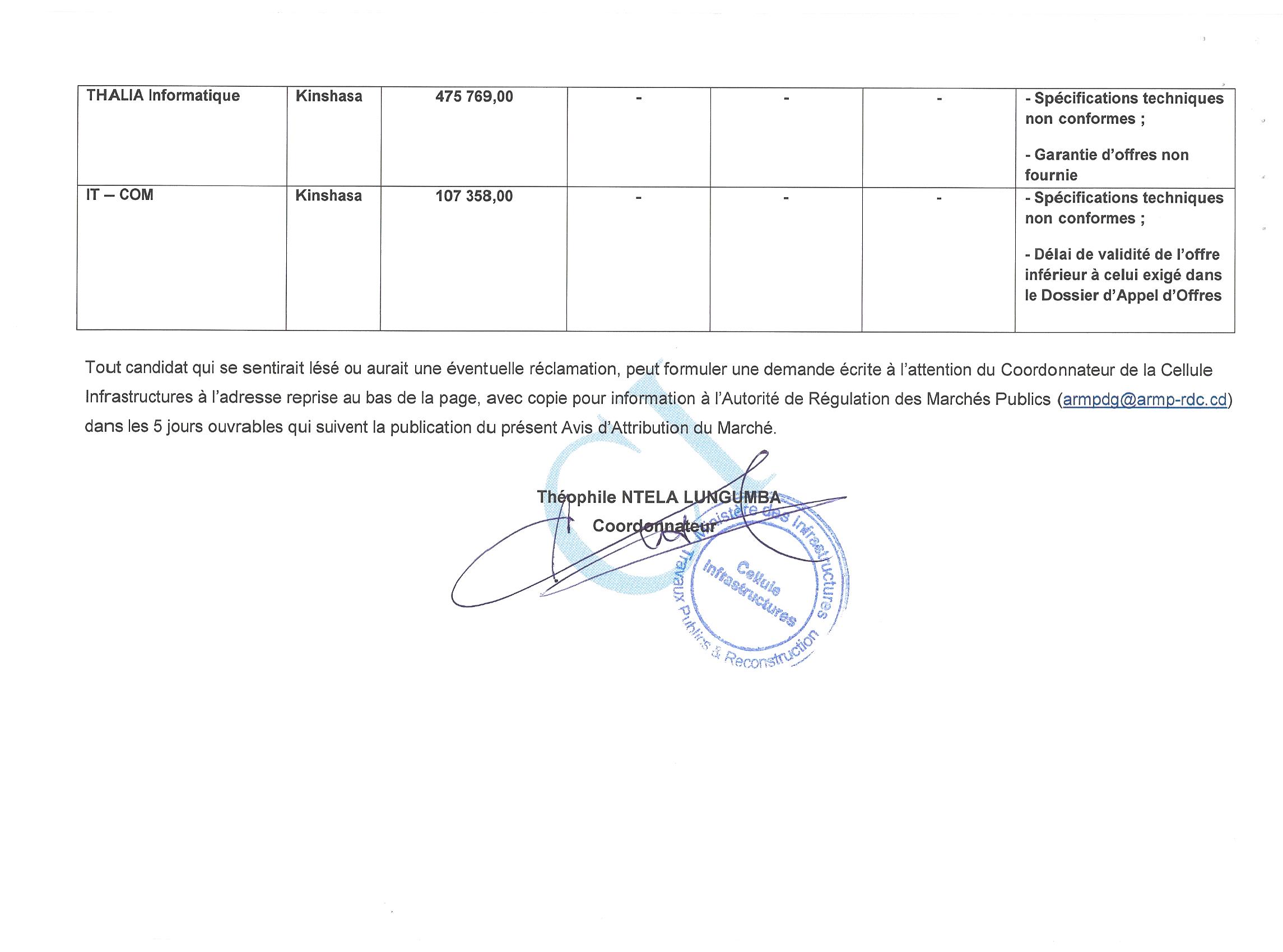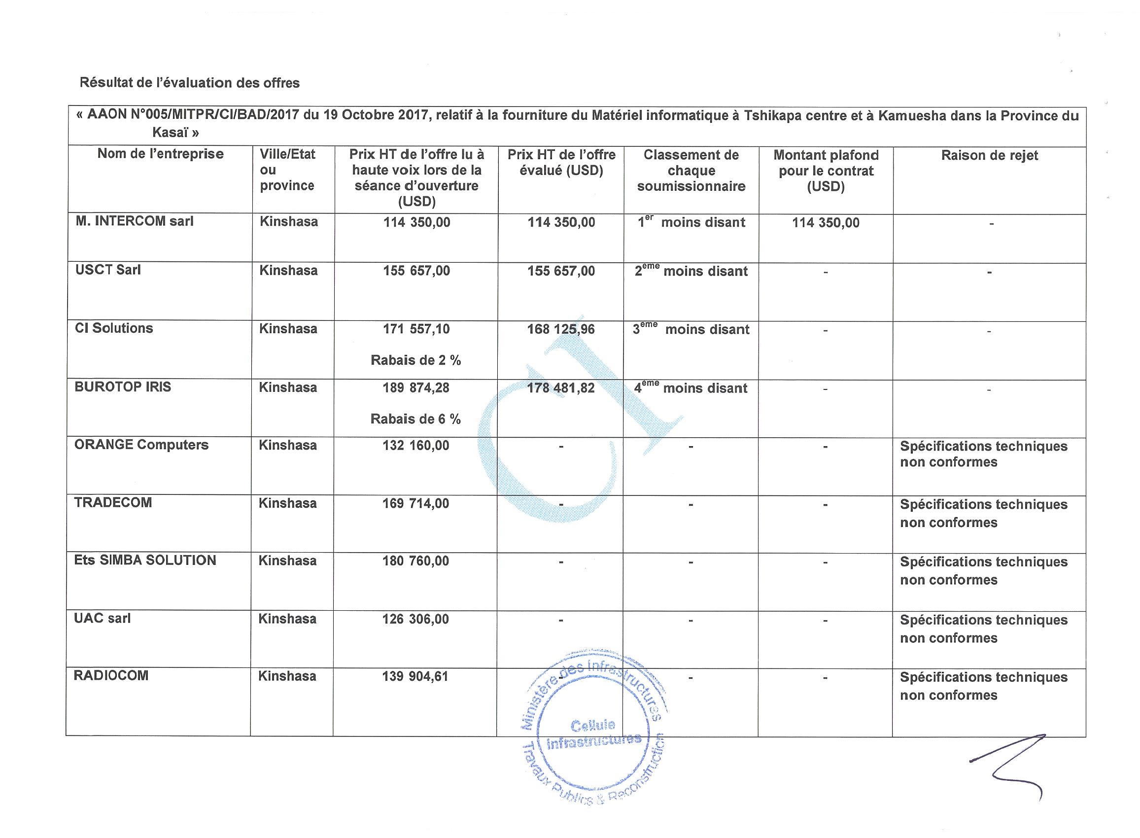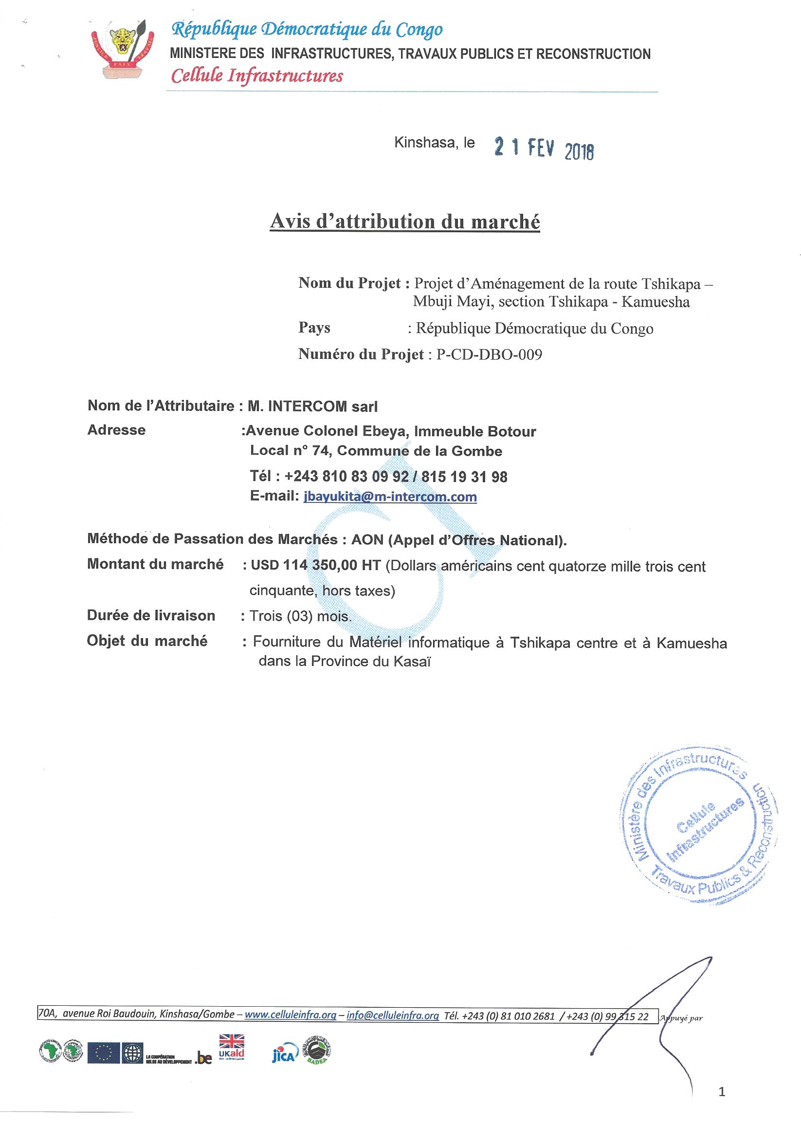 Attribution du marché relatif à la fourniture du matériel informatique à Tshikapa centre et à kamuesha dans la province du Kasaï à la société M. INTERCOM SARL.