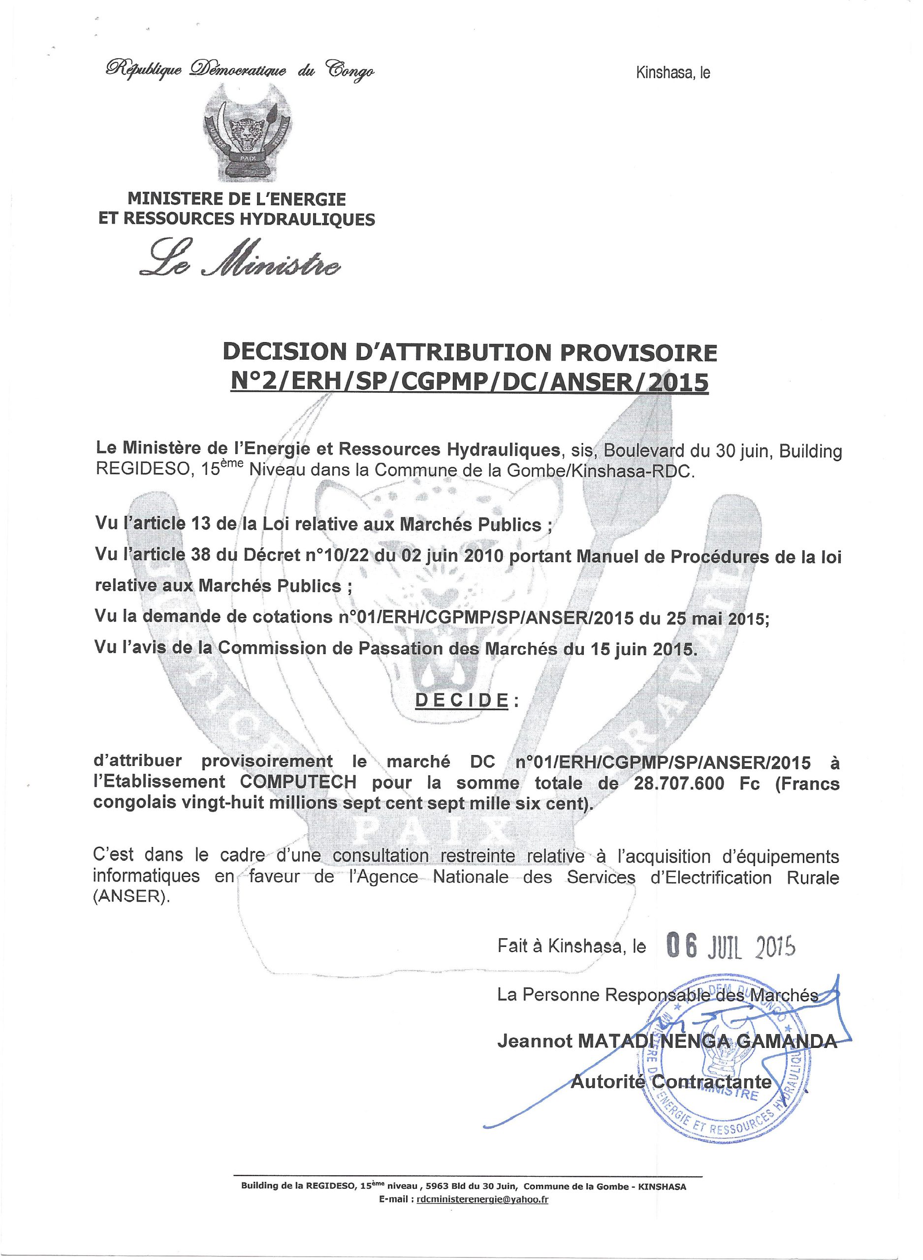 Attribution provisoire accordée à l’établissement COMPUTECH du marché relatif à l’acquisition d’équipements informatiques en faveur de l’agence nationale des services d’électrification rurale (ANSER).
