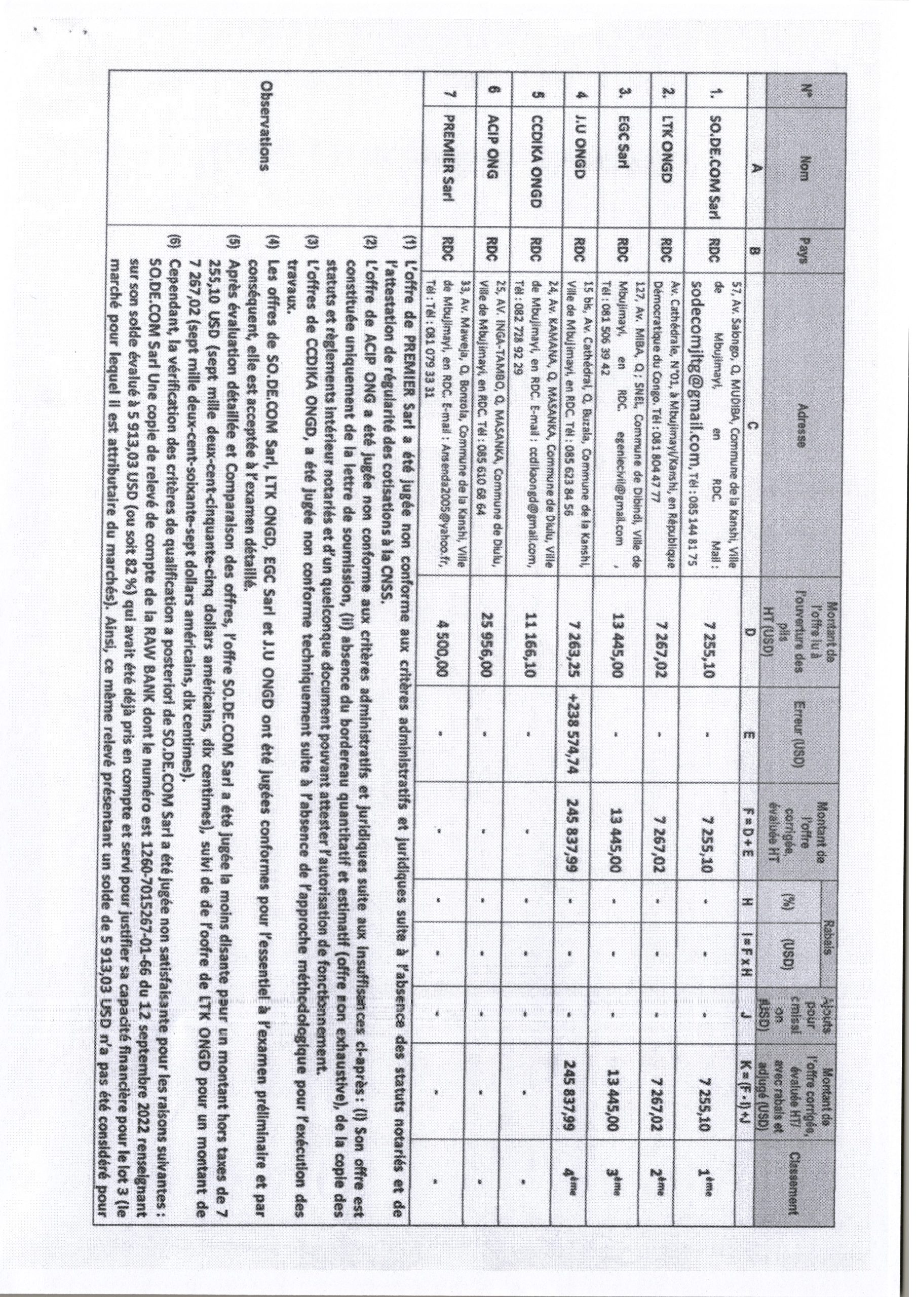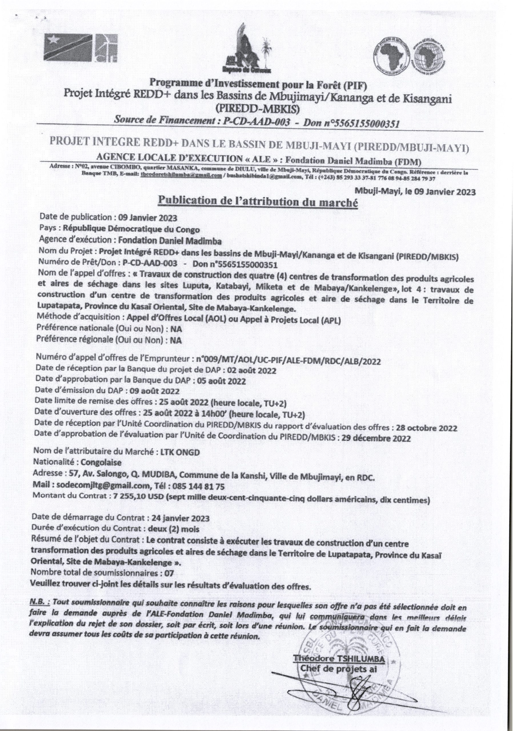 Attribution provisoire accordé à la société LTK ONGD relative au Lot 4 : Travaux de construction d’un centre de transformation des produits agricoles et aire de séchage dans le Territoire de Lupatapata, Province du Kasai Oriental, Site de Mabaya-Kankelenge.