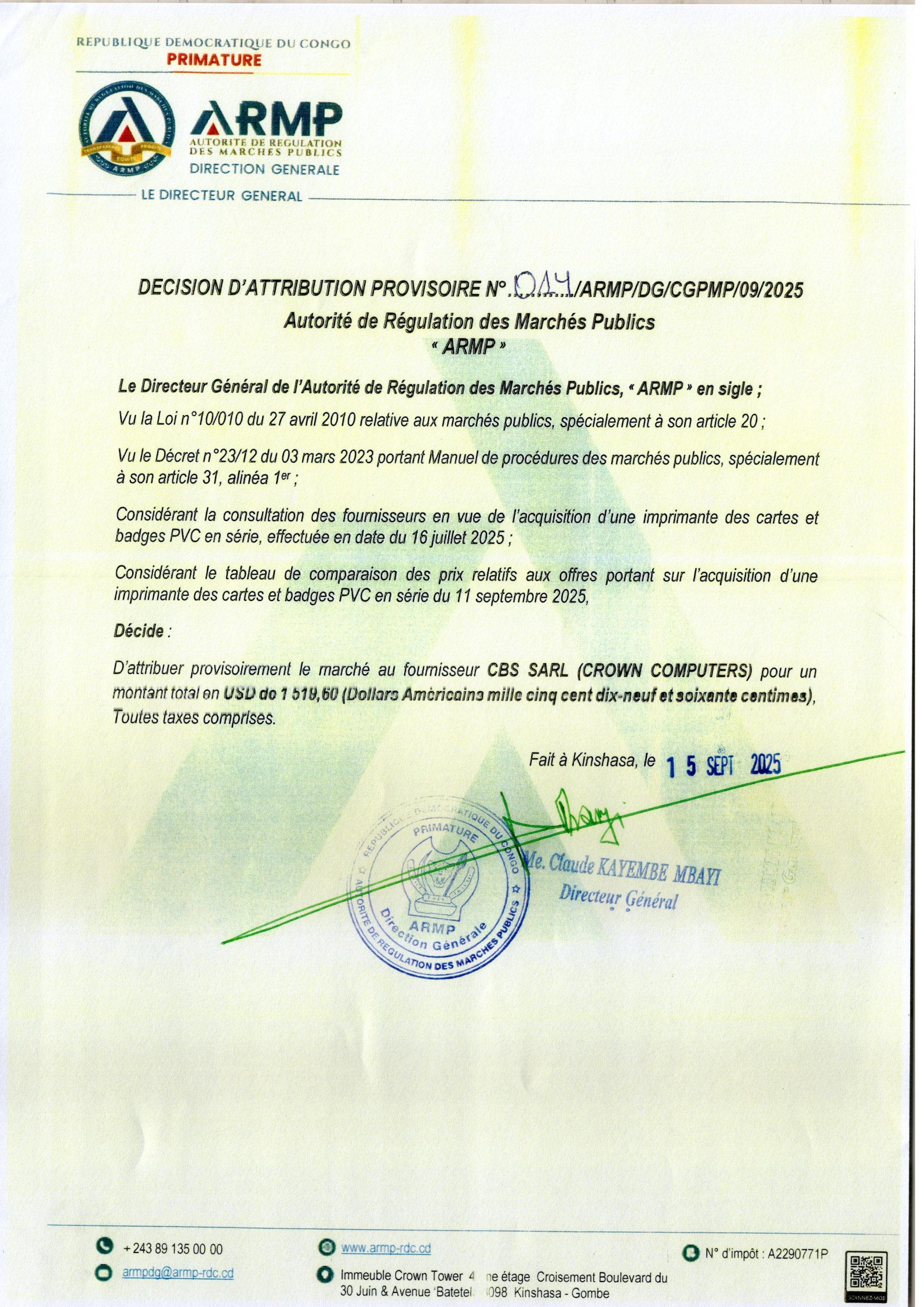 Attribution provisoire accordée à CBS SABL (CROWN COMPUTERS) relative à l’acquisition d’une imprimante des cartes et badges PVC en serie