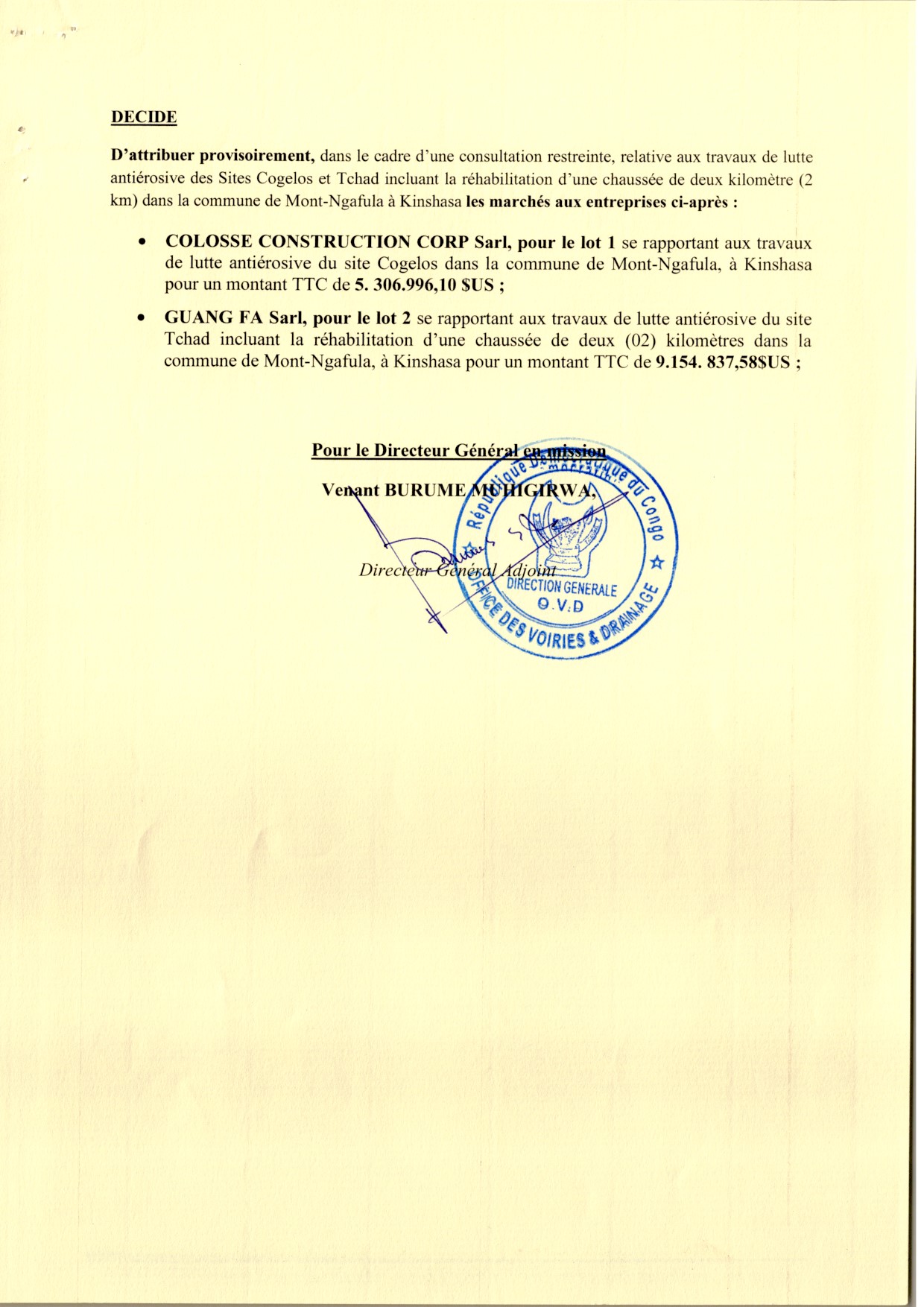Attribution provisoire accordée à COLOSSE CONSTRUCTION CORP (lot 1) et GUANG FA (lot 2) relative aux travaux de lutte antiérosive des sites Congolos et Tchad incluant la réhabilitation d’une chaussée de deux kilomètre (km) dans la commune de Mont-Ngafula à Kinshasa.
