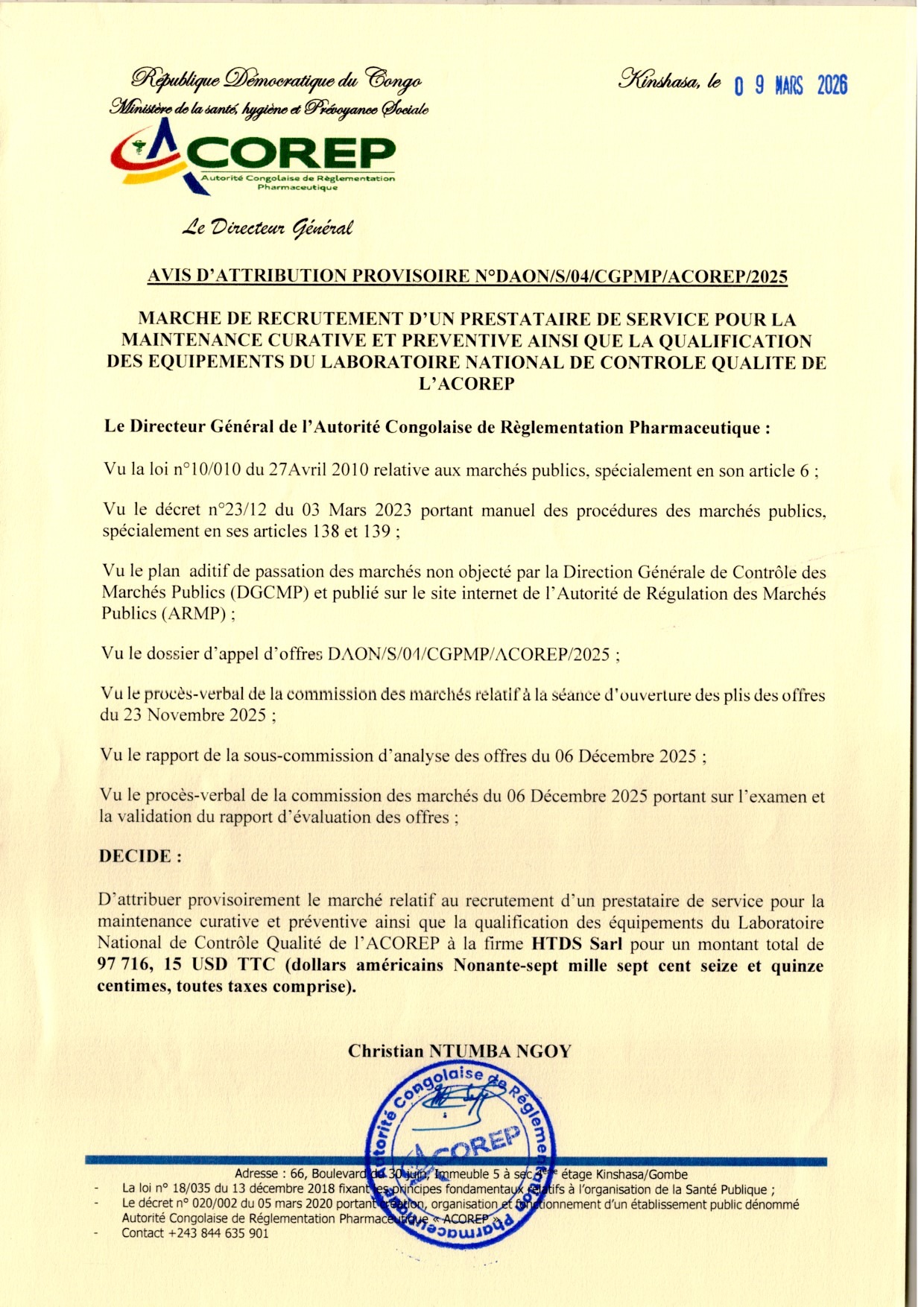 Attribution provisoire accordée à la Firme HTDS relative au recrutement d’un prestataire de service pour la maintenance curative et préventive ainsi que la qualification des équipements du Laboratoire National de Contrôle Qualité de l’ACOREP