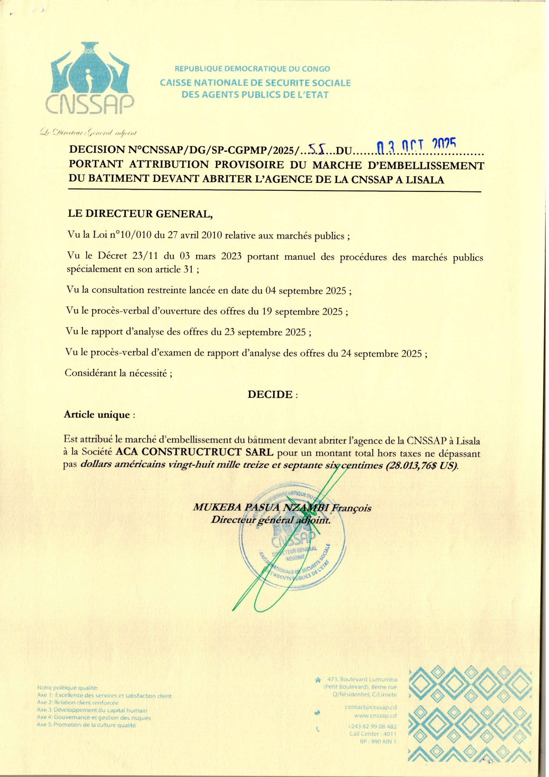 Attribution provisoire accordée à la société ACA CONSTRUCTRUCT SARL relatif au marché d’embellissement du bâtiment devant abriter l’agence de la CNSSAP à Lisala.