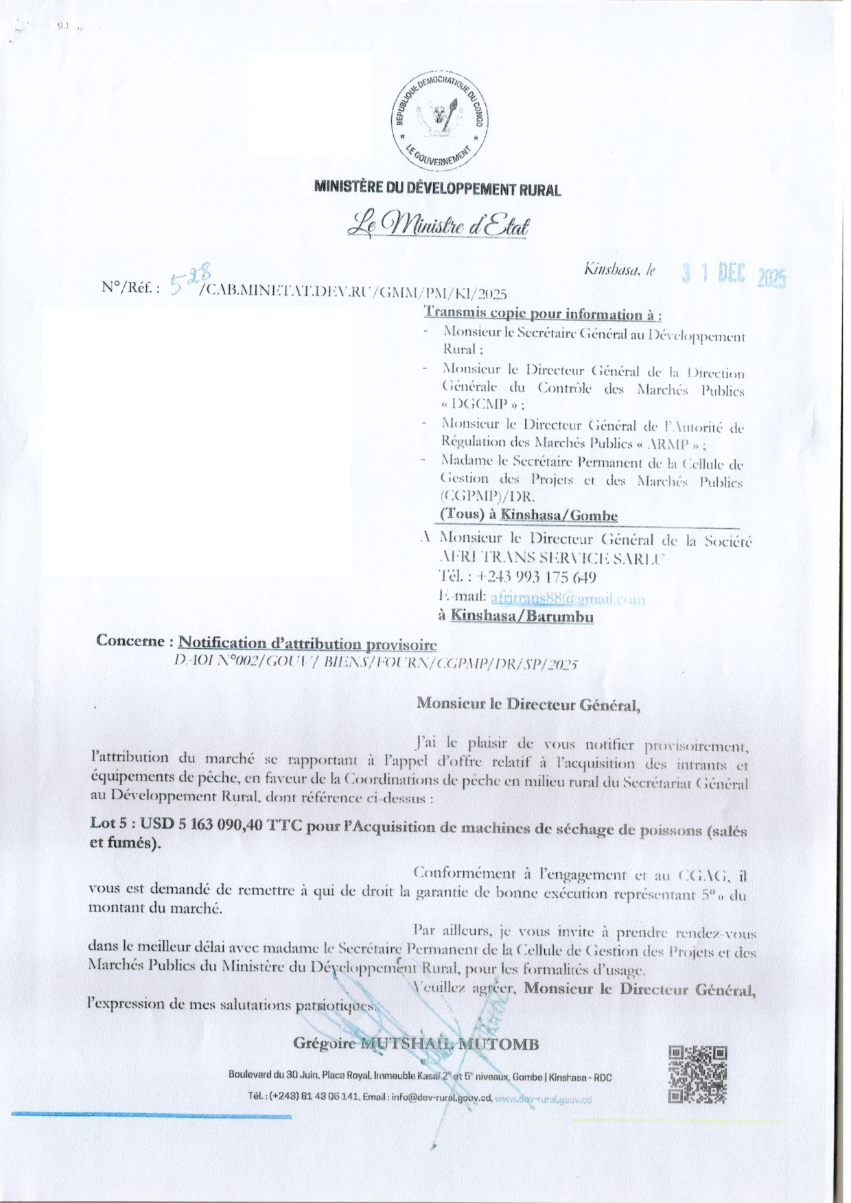 Attribution provisoire accordée à la société AFRI TRANS SERVICE SARL relative à l’acquisition de machine de séchage de poissons (salés et fumés) ( lot 5)