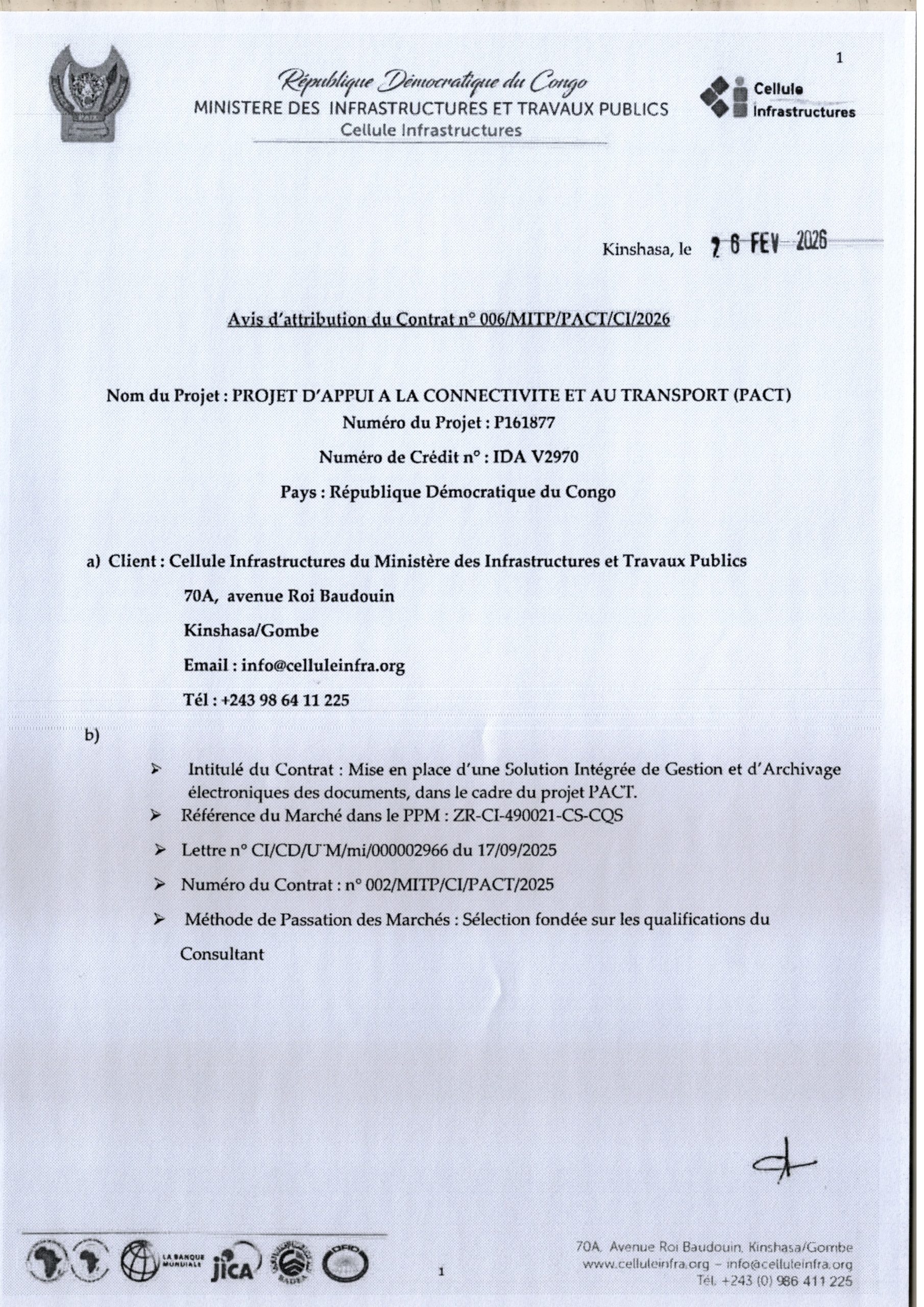 Attribution provisoire accordée à la société “AFRICA DIGITAL SYSTEM” relative au marché de mise en place d’une solution intégrée de gestion et d’archivage électronique des documents, dans le cadre du Projet PACT.