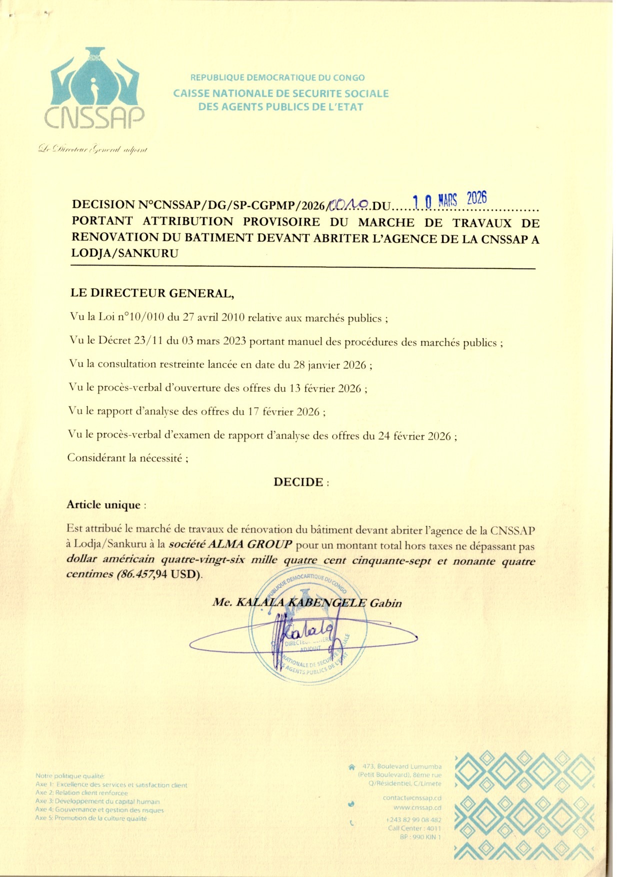 Attribution provisoire accordée à la société ALMA GROUP relative aux travaux de rénovation du bâtiment devant abriter l’agence de la CNSAAP à Lodja/Sankuru.