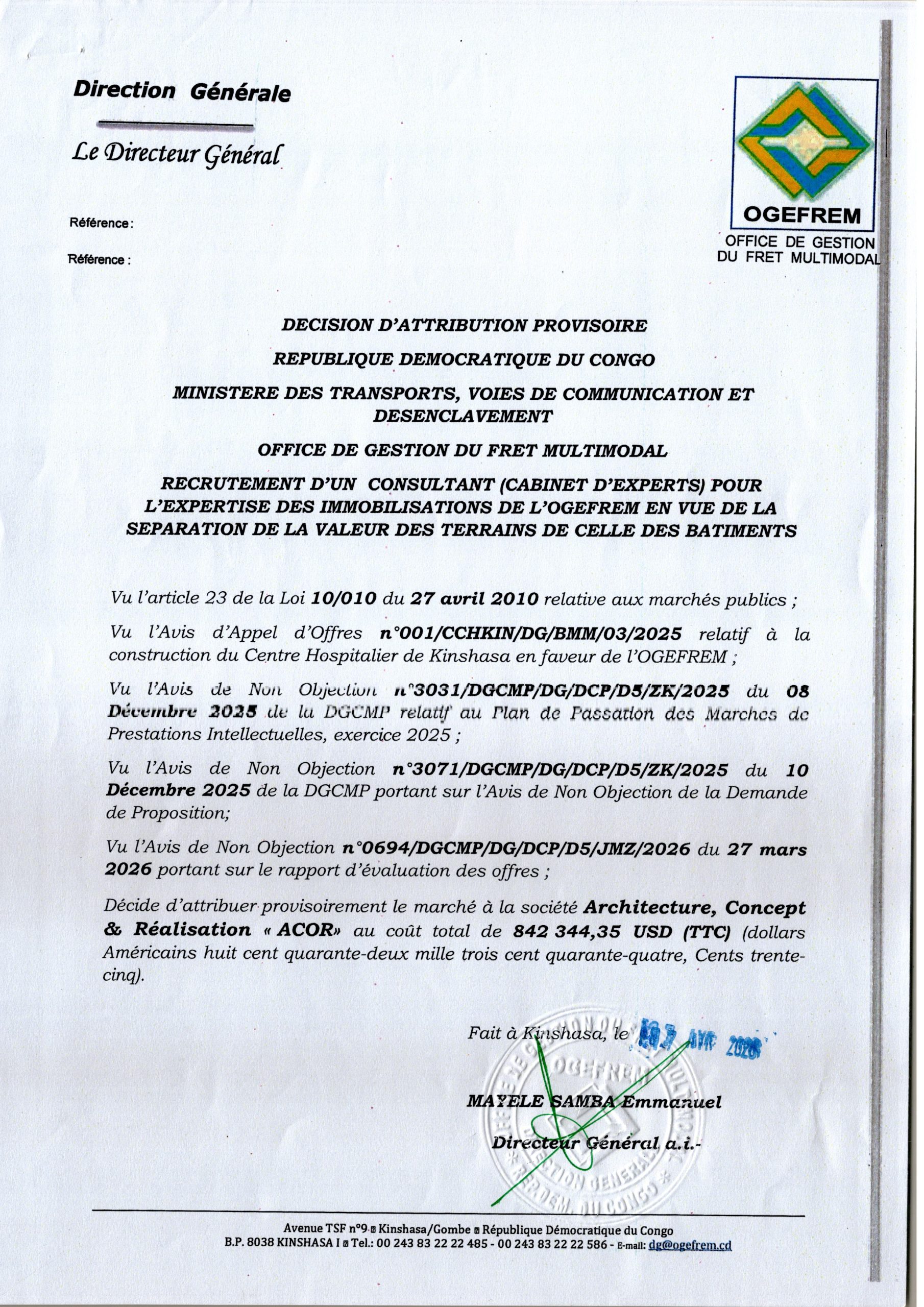 Attribution provisoire accordée à la société Architecture, Concept & Réalisation “ACOR” relative au recrutement d’un consultant (cabinet d’experts) pour l’expertise des immobilisations de l’OGEFREM en vue de la séparation de la valeur des terrains de celle des Bâtiments.