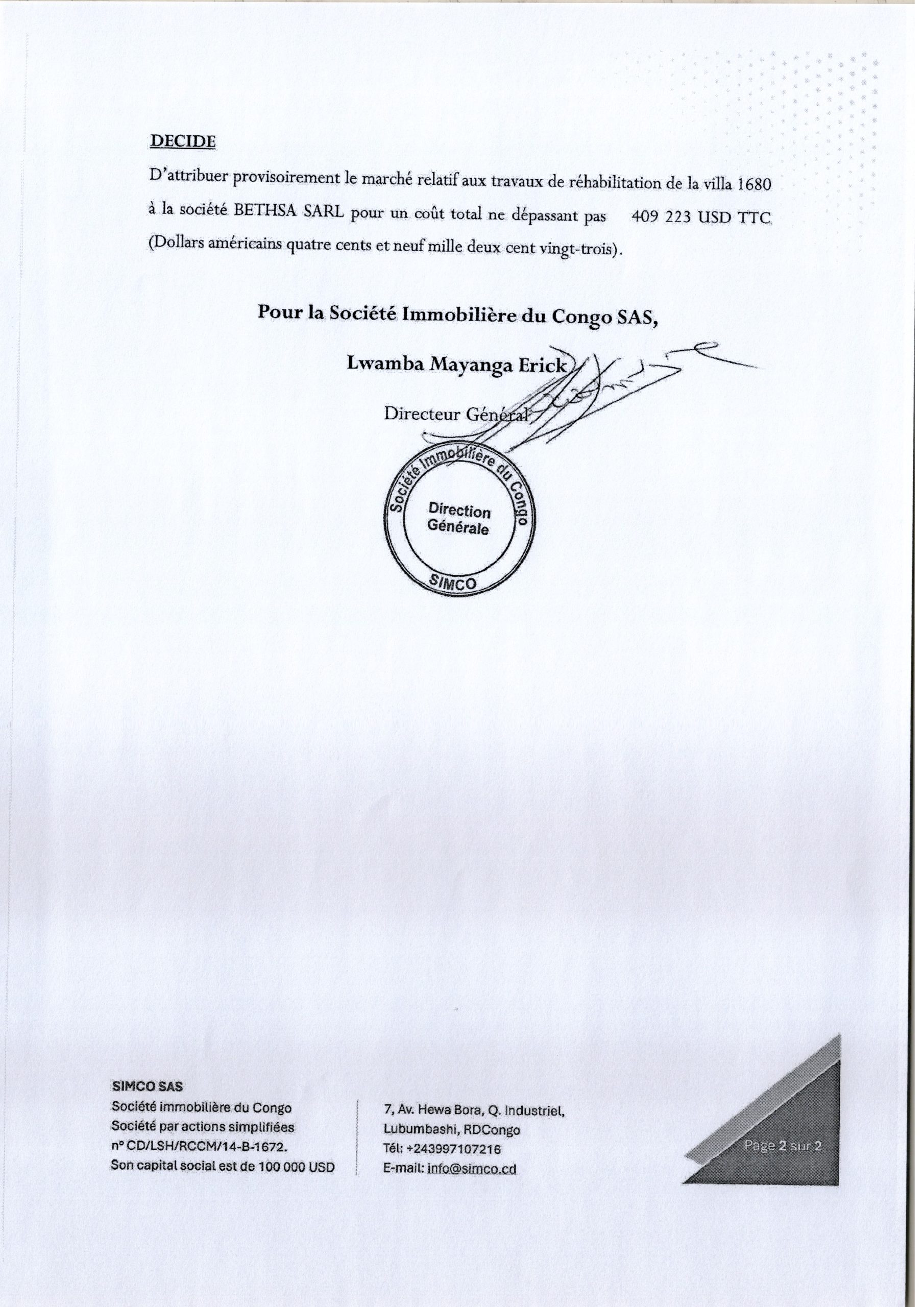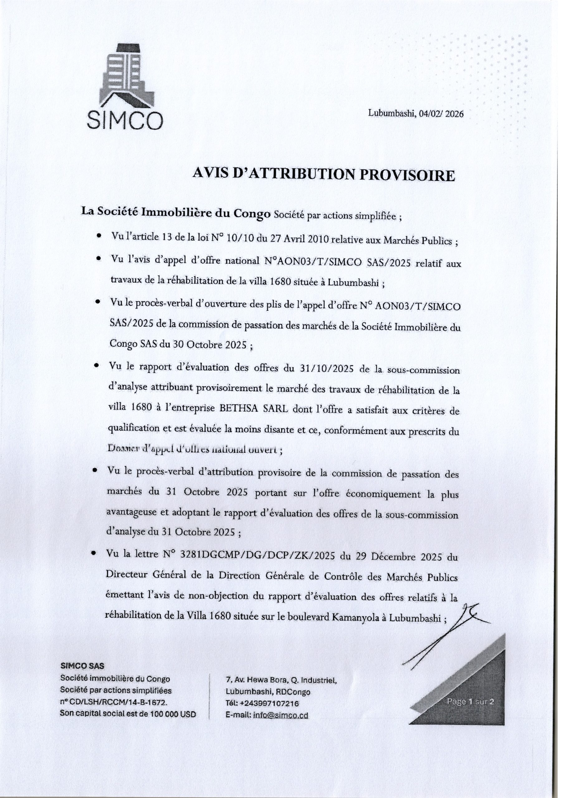 Attribution provisoire accordée à la société BETHSA SARL relative aux travaux réhabilitation de la ville 1680 située à Lubumbashi.