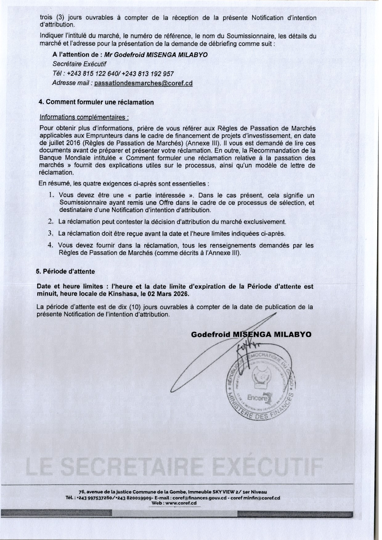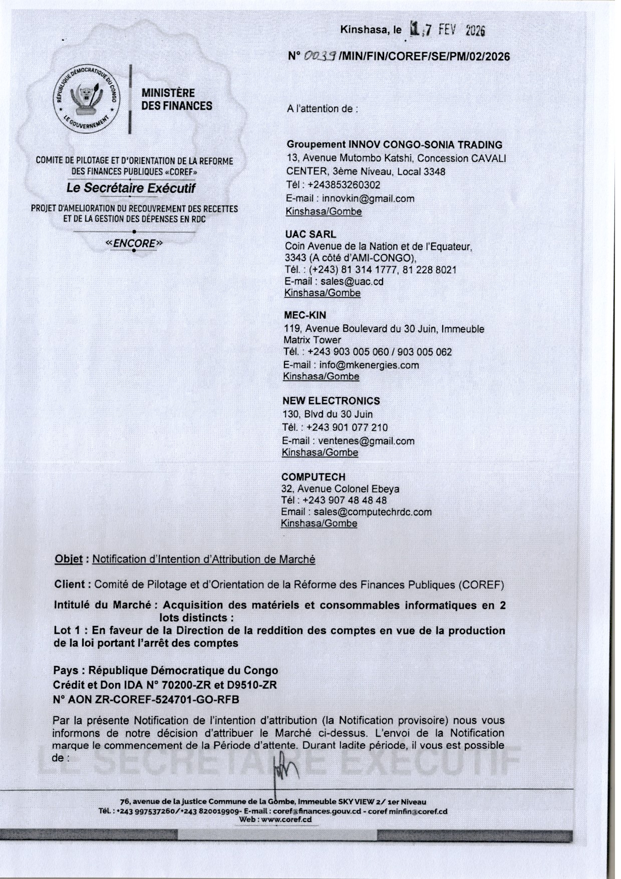 Attribution provisoire accordée à la société BUROTOP IRIS relative à l’acquisition des matériels et consommables informatiques en 2 lots distincts : lot 1 : en faveur de la Direction de la reddition des comptes en vue de la production de la loi portant l’arrêt des comptes.