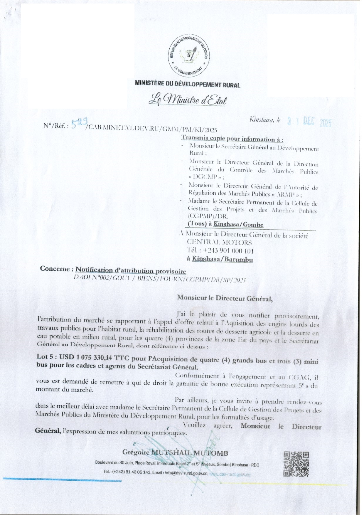 Attribution provisoire accordée à la société CENTRAL MOTORS relative à l’acquisition de quatre (4) grands bus et trois (3) mini bus pour les cadres et agents du Secrétariat Général (lot 5)