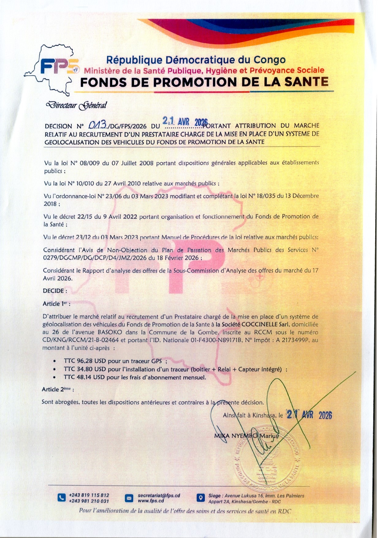 Attribution provisoire accordée à la Société COCCINELLE relative au recrutement d’un prestataire chargé de la mise en place d’un Système de Géolocalisation des Véhicules du Fonds de Promotion de la Santé.