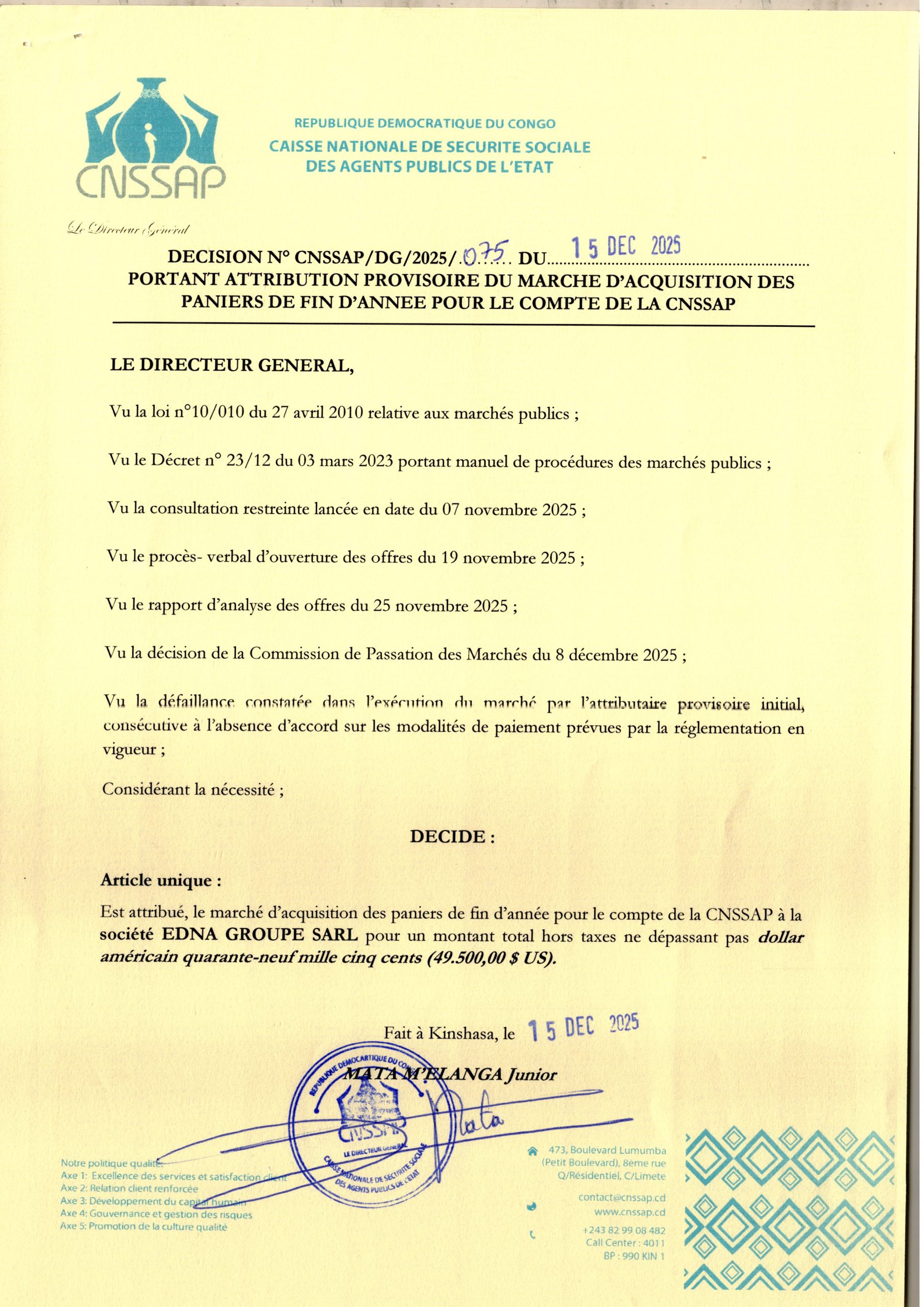 Attribution provisoire accordée à la société “EDNA GROUPE Sarl” relative au marché d’acquisition des paniers de fin d’année pour le compte de la CNSSAP.