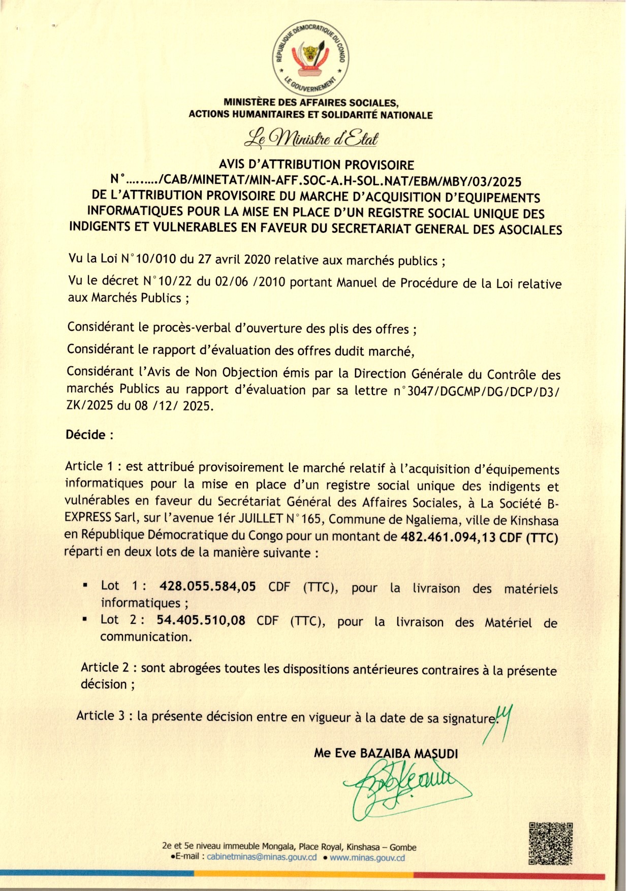 Attribution provisoire accordée à la société B- EXPRESS relative à l’acquisition d’équipements Informatiques pour la mise en place d’un Registre Social Unique des indigents et vulnérables en faveur du Secrétaire Général des Asociales (lot 1 et lot 2).