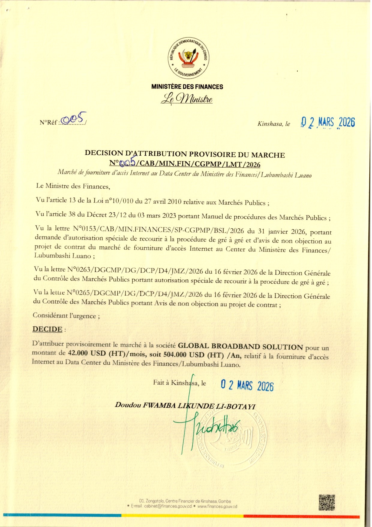 Attribution provisoire accordée à la société GLOBAL BROADBAND SOLUTION relative à la fourniture d’accès Internet au Data Center du Ministère des Finances/Lubumbashi Luano.