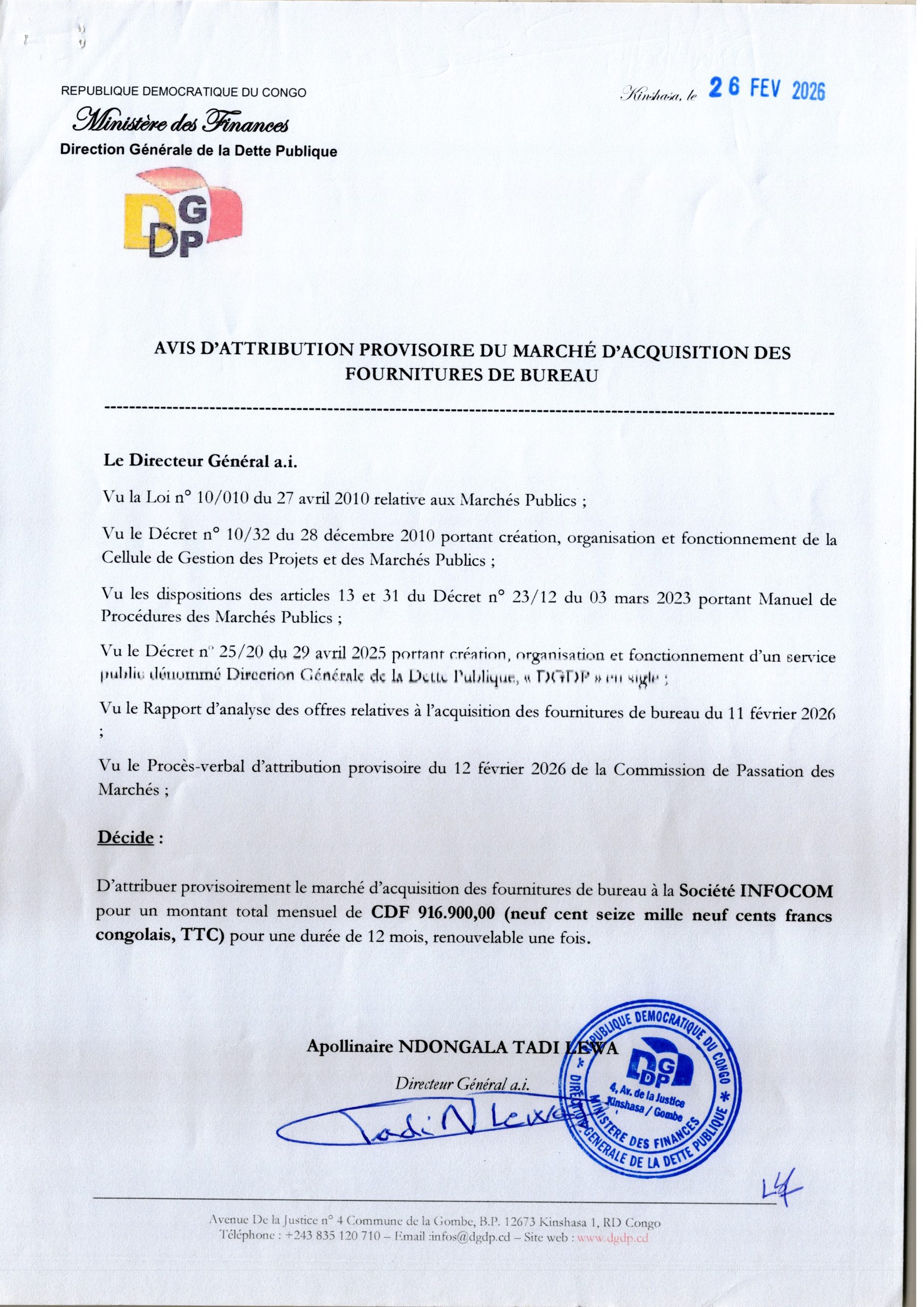 Attribution provisoire accordée à la société “INFOCOM” relative au marché d’acquisition des fournitures de bureau.