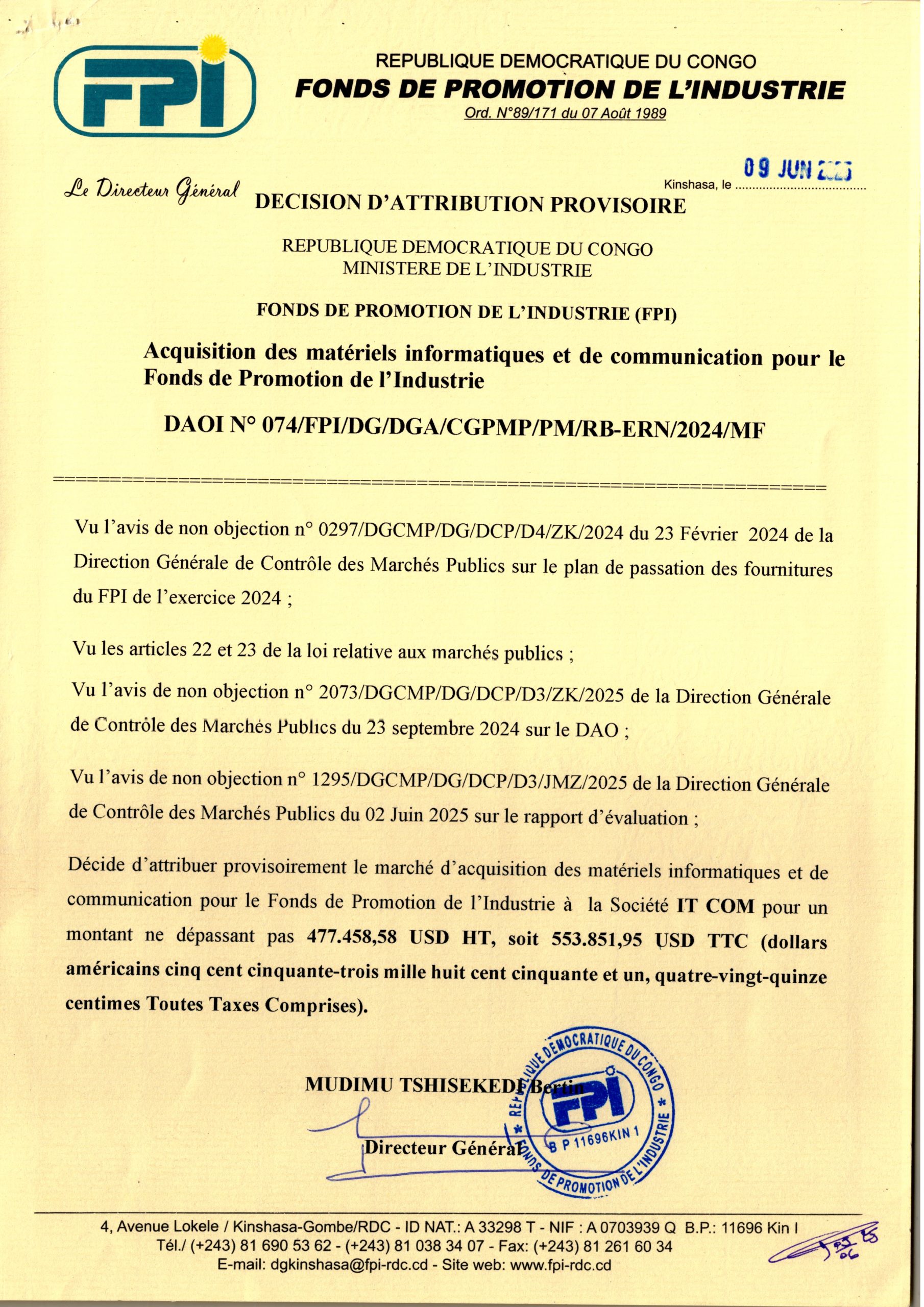 Attribution provisoire accordée à la société IT COM relative à l’acquisition des matériels informatiques et de communication pour le Fonds de Promotion de l’Industrie.