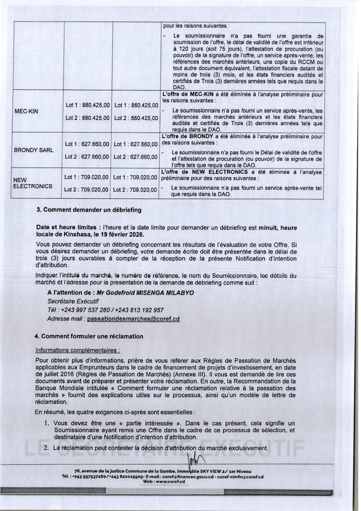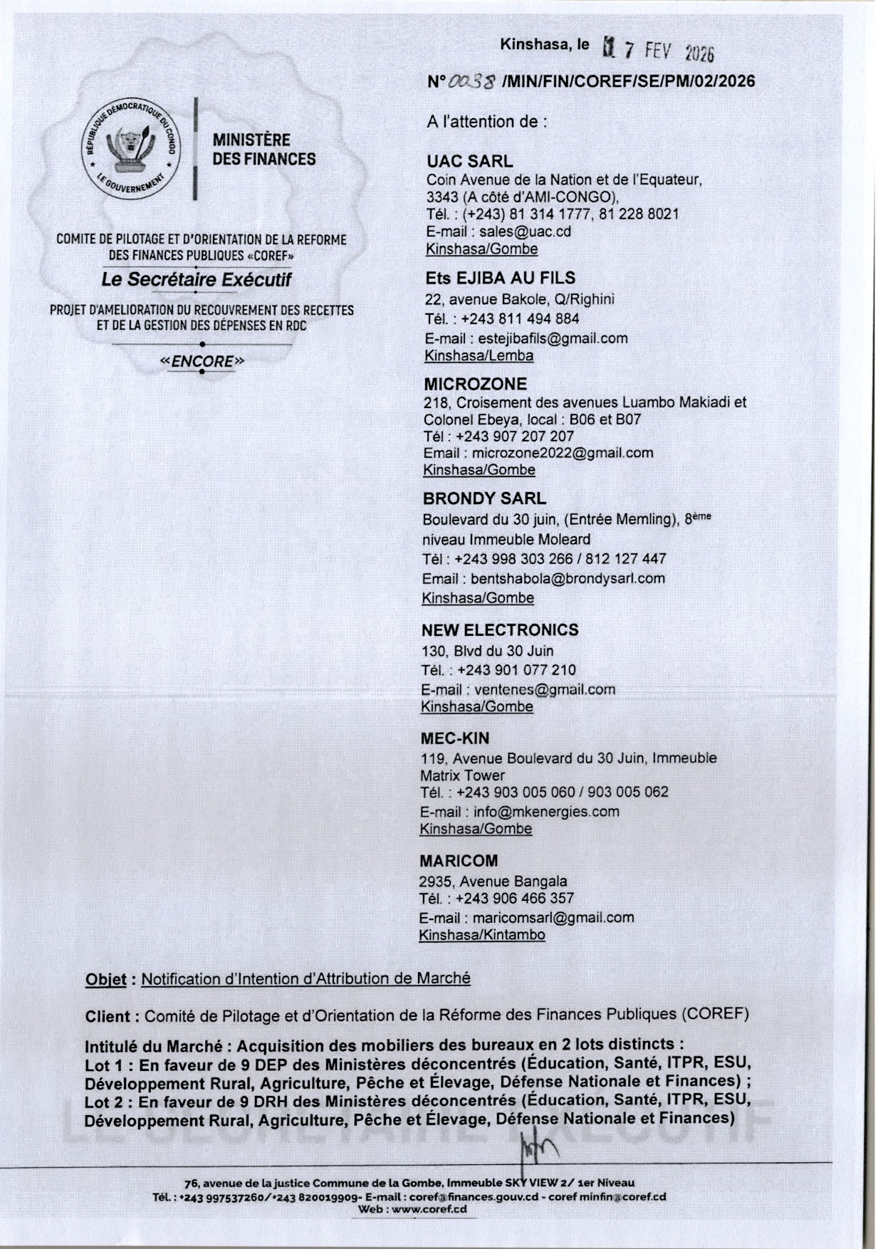 Attribution provisoire accordée à la société MARICOM (lot 1): en faveur de 9 DEP des Ministères Déconcentrés et (lot 2) en faveur de DRH des Ministères déconcentrés marchés relatif à l’acquisition des mobiliers des bureaux en 2 lots distincts.