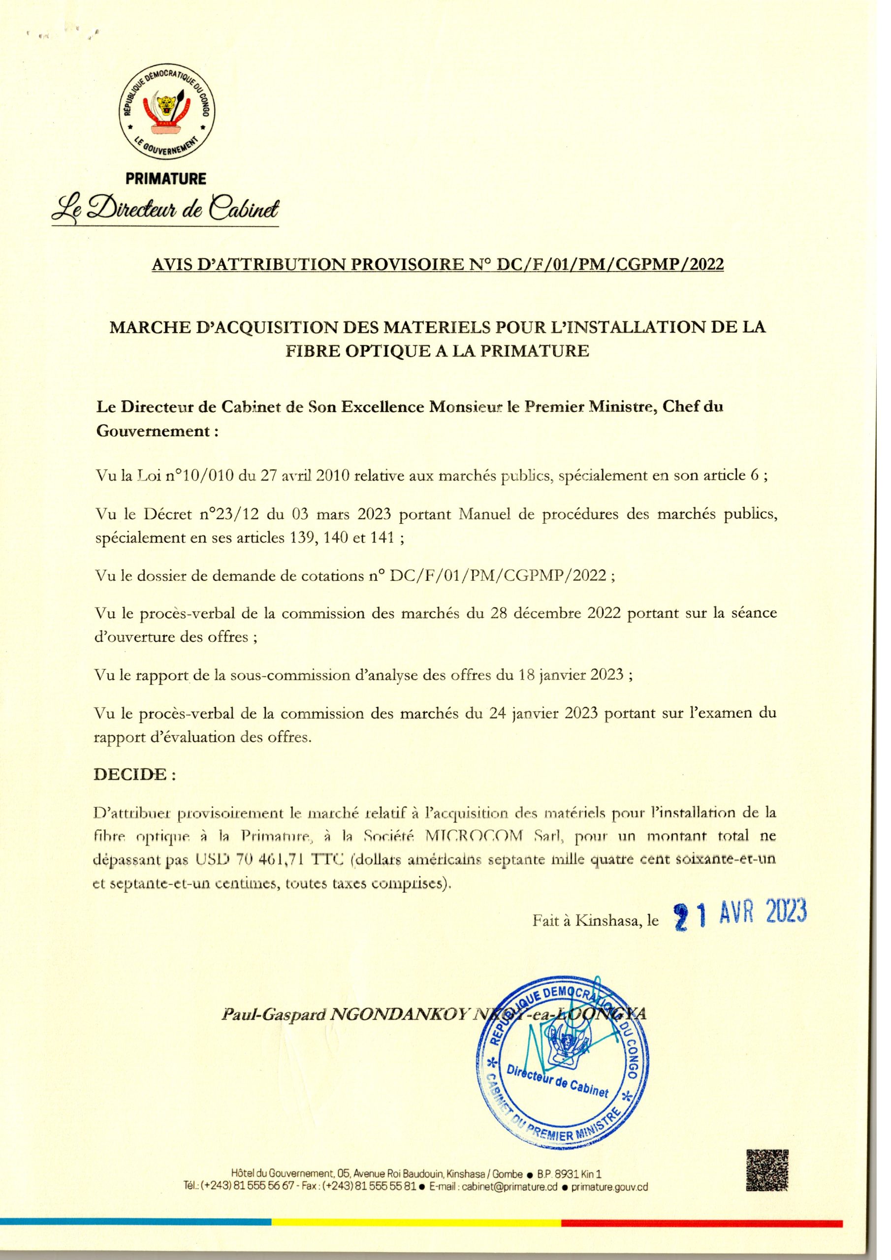 Attribution provisoire accordée à la société MICROCOM relative à l’acquisition des matériels pour l’ installation de la fibre optique a la PRIMATURE.