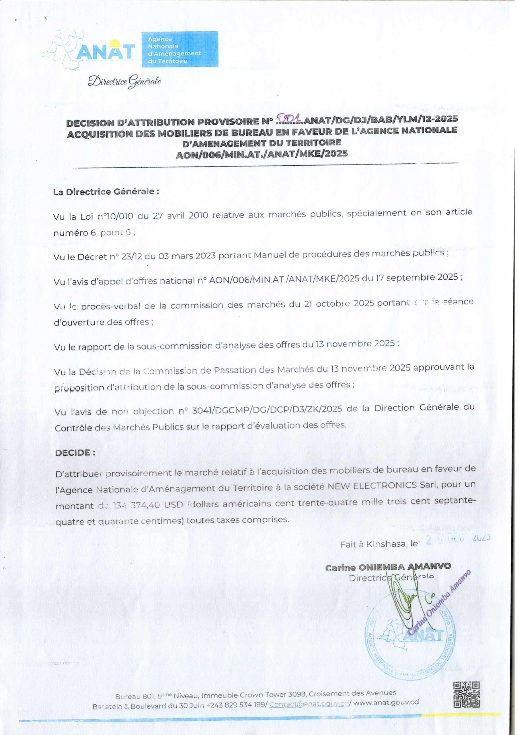 Attribution provisoire accordée à la société NEW ELECTRONICS Sarl relative à l’acquisition des mobiliers de bureau en faveur de l’Agence Nationale d’Aménagement du Territoire.